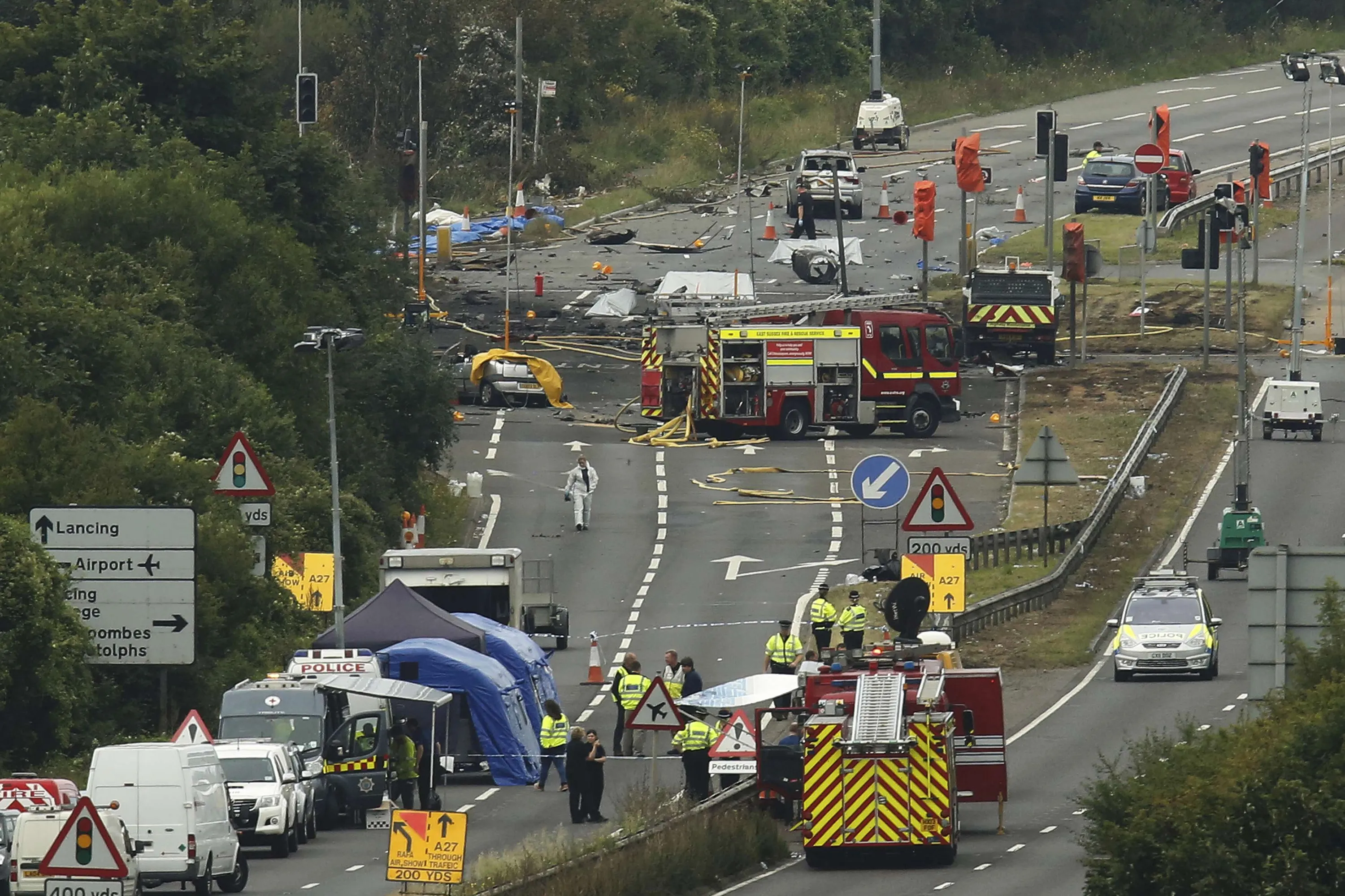 Emergency services and crash investigation officers work at the site where a Hawker Hunter fighter jet crashed onto the A27 road at Shoreham near Brighton, Britain August 23, 2015. A jet aircraft ploughed into several cars on a busy road near an airshow in southern England on Saturday, killing at least seven people, police said. (Photo by Luke MacGregor/Reuters)