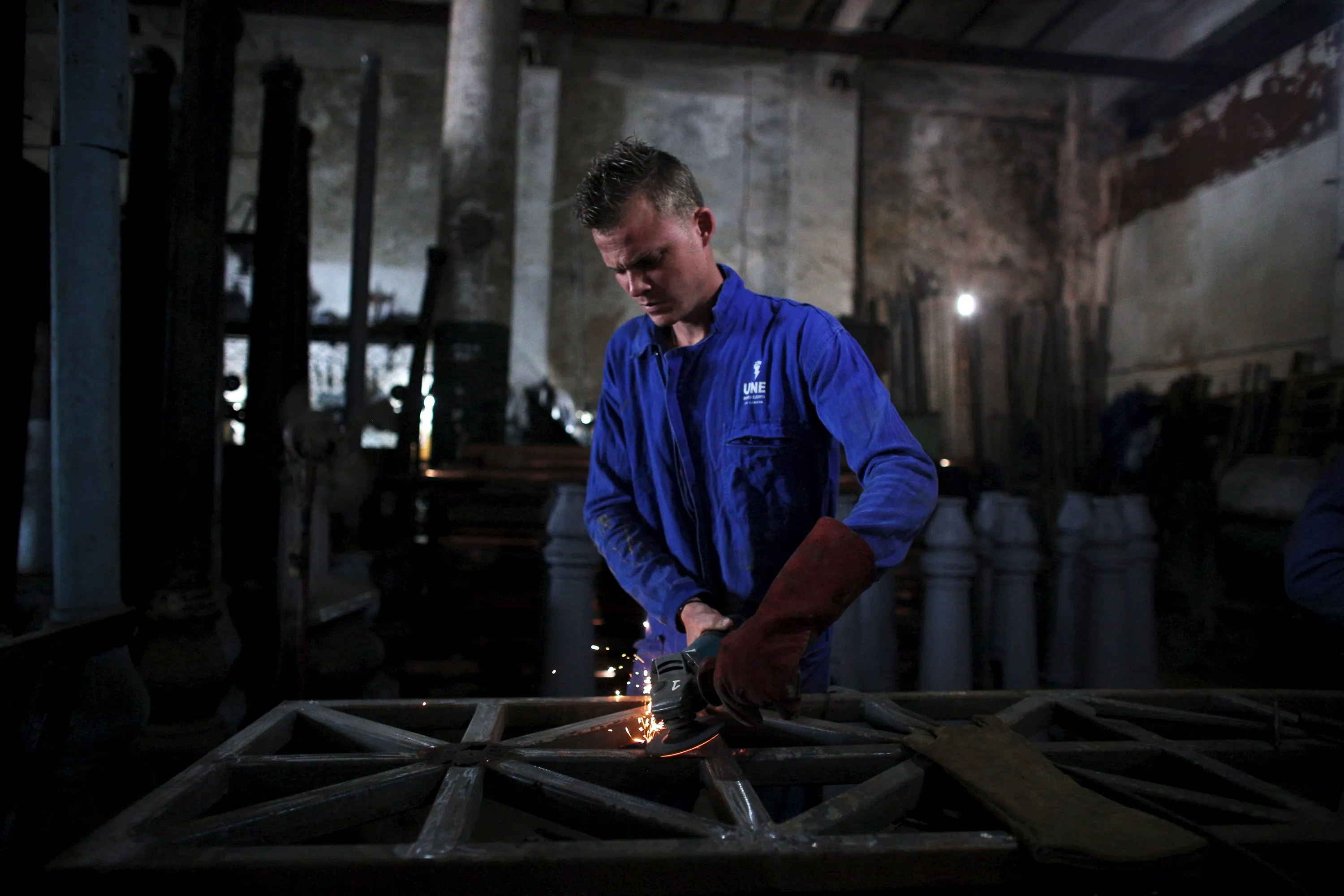 Jorge Fajardo, 24, welds a fence in a small factory in downtown Havana, April 16, 2015. (Photo by Alexandre Meneghini/Reuters)