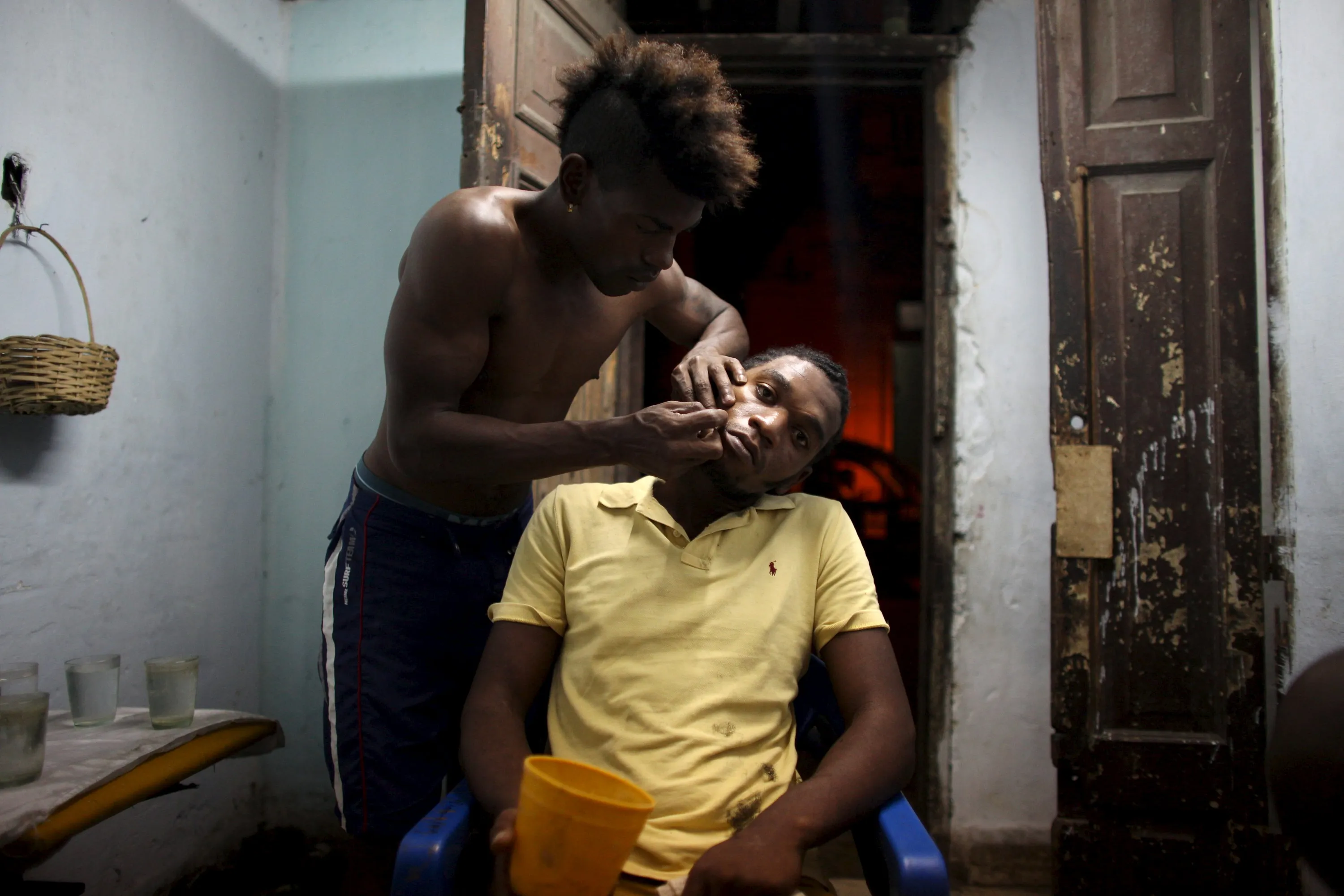 Ifrain Garcia, 23, has his hair cut at home by his friend Joel Drecker, 32, a gardener, in downtown Havana, April 9, 2015. (Photo by Alexandre Meneghini/Reuters)