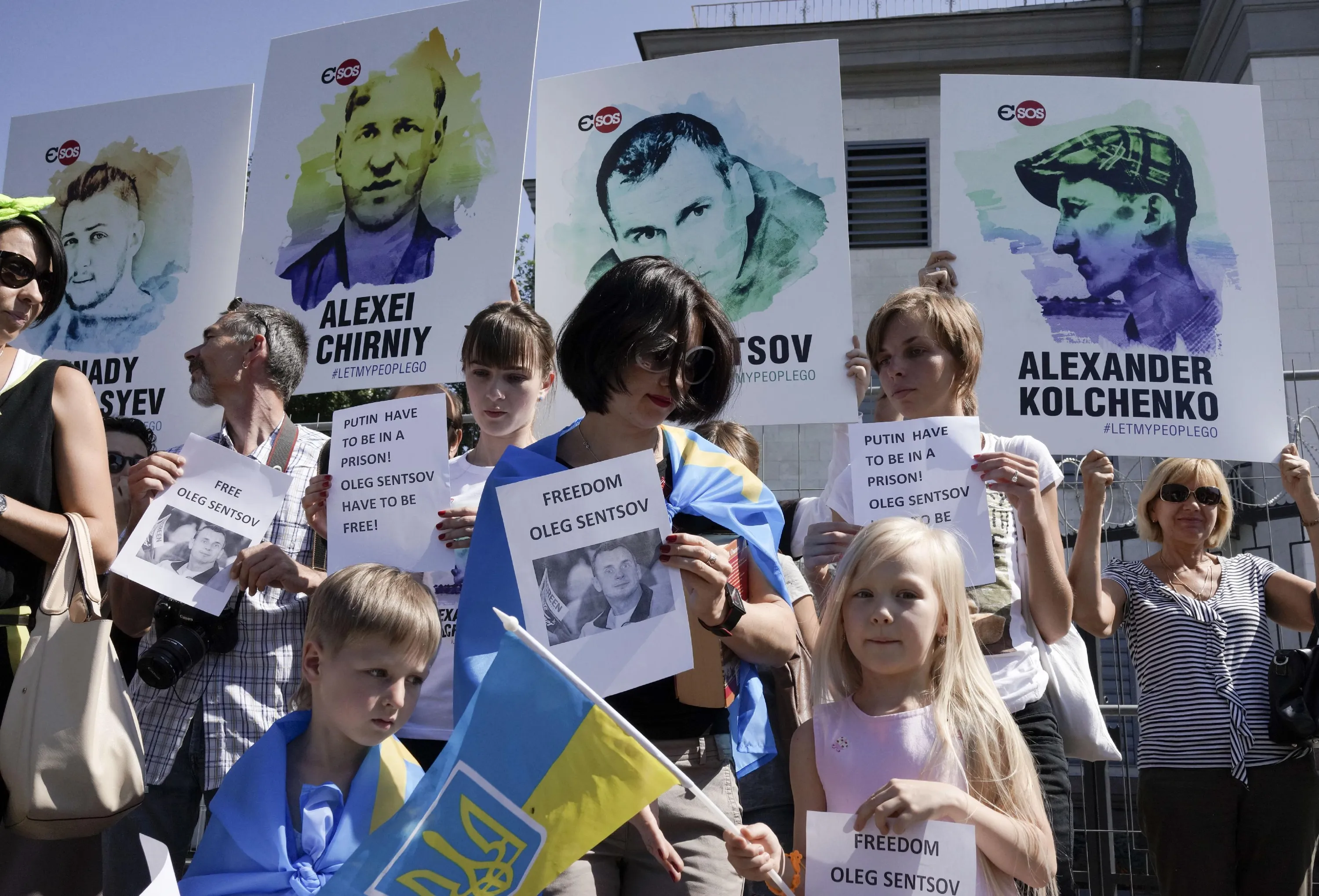 People protest in front of the Embassy of the Russian Federation to support Oleg Sentsov and other political prisoners in Kiev, Ukraine, Tuesday, August 25, 2105. A Russian court convicted a prominent Ukrainian filmmaker on Tuesday of conspiring to commit terror attacks and sentenced him to 20 years in prison. The court in the southern city of Rostov-on-Don said Oleg Sentsov had set up a terror cell in the Crimean Peninsula, which Russia annexed last year, and was plotting attacks. He will serve time in a maximum-security prison. (Photo by Efrem Lukatsky/AP Photo)