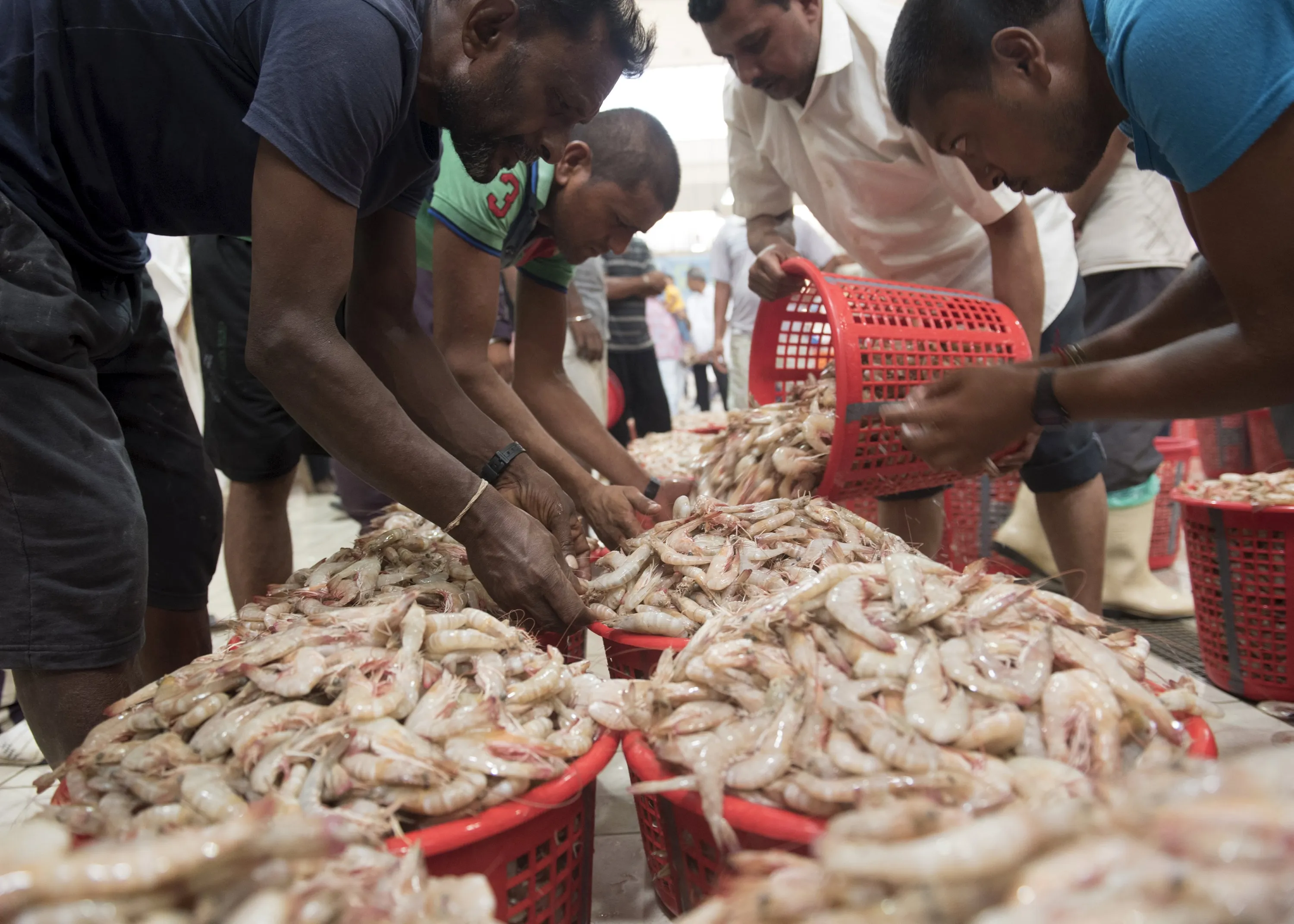 Workers prepare baskets of shrimp just ahead of it being auctioned off in the Kuwait Fishmarket in Sharq, Kuwait City, August 25, 2015. (Photo by Stephanie McGehee/Reuters)