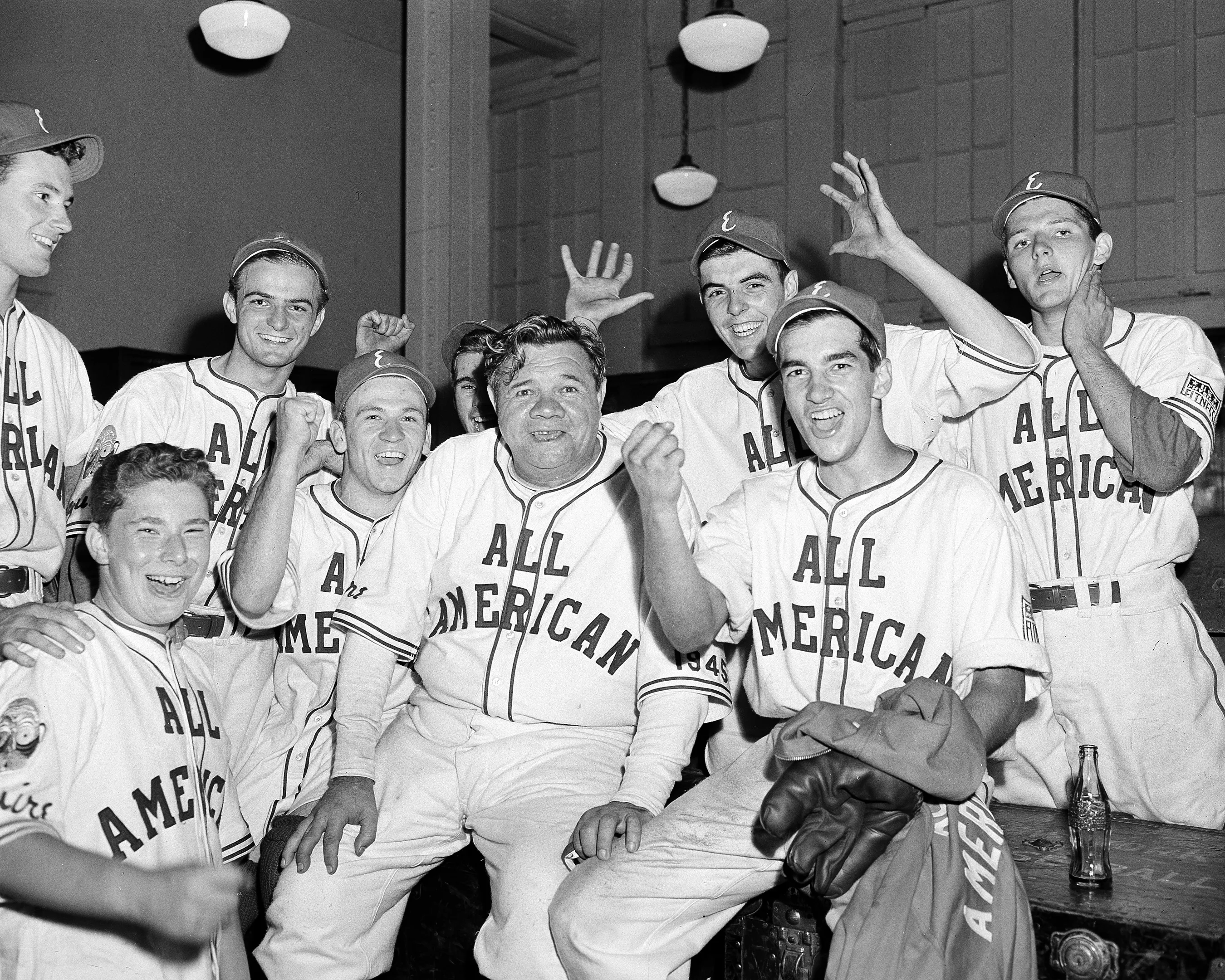 Yankees' legend Babe Ruth, center, is seen with some of his players on the All-American Boys East team as they cheer their 5-4 victory over the All-American West team in the second annual Esquire All-American baseball game at the Polo Grounds in New York, August 28, 1945. From left to right: mascot Harve Fischman, of Chicago, not wearing cap; Ted Mace of New Orleans; Bill Glane of Detroit; Eddie Coppinger, of Medford, Mass., behind Ruth; Ruth; Curtis Simmons of Egypt, Pa.; Joe Della Monica of Brooklyn, N.Y.; and Burt Stanford of Brimingham, Alabama. (Photo by Harry Harris/AP Photo)