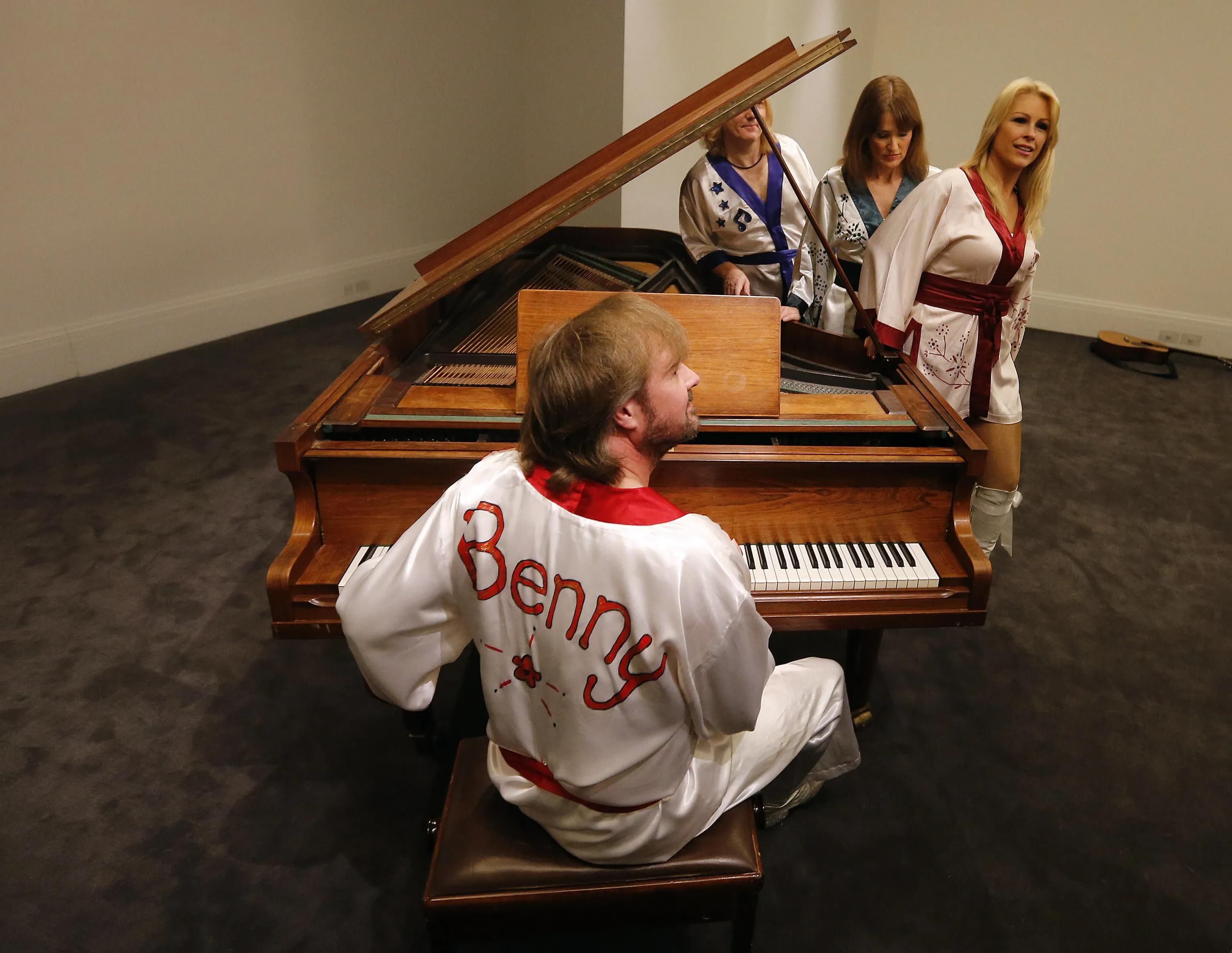 Actors of the ABBA show “Bjoern Again” perform on a piano at Sotheby's auction house in London, Thursday, August 27, 2015. (Photo by Frank Augstein/AP Photo)