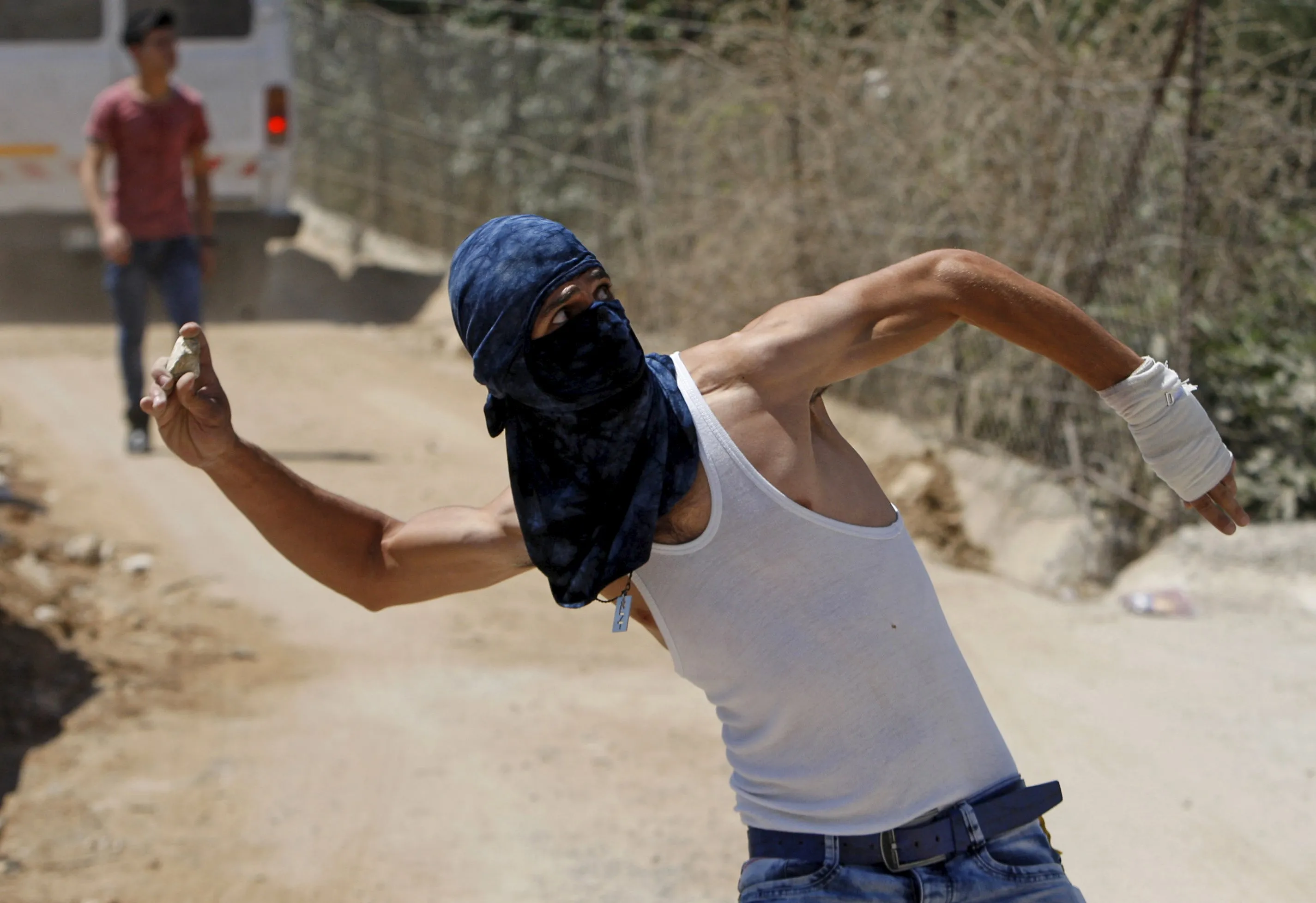 A masked Palestinian throws stones during a protest against what organizers say is land confiscation by Israel to make way for the Israeli barrier in the occupied West Bank city of Beit Jala, near Bethlehem September 6, 2015. (Photo by Mussa Qawasma/Reuters)