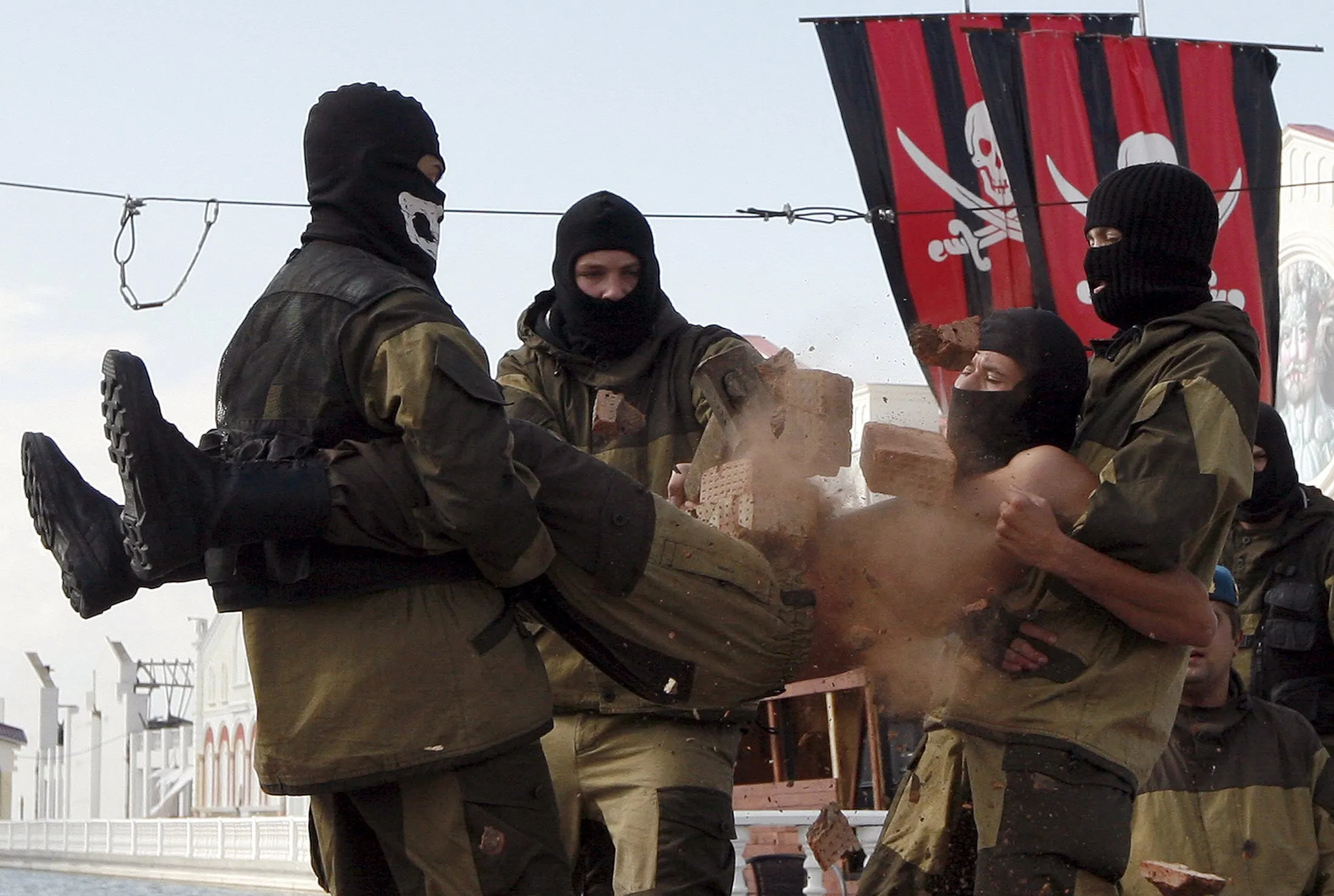 A member of the Pokrov youth military-patriotic club crushes a pile of bricks with a hammer on the stomach of a comrade as they demostrate their skills at Siberian Venice Park outside the Siberian town of Sosnovoborsk, Russia, September 6, 2015. (Photo by Ilya Naymushin/Reuters)