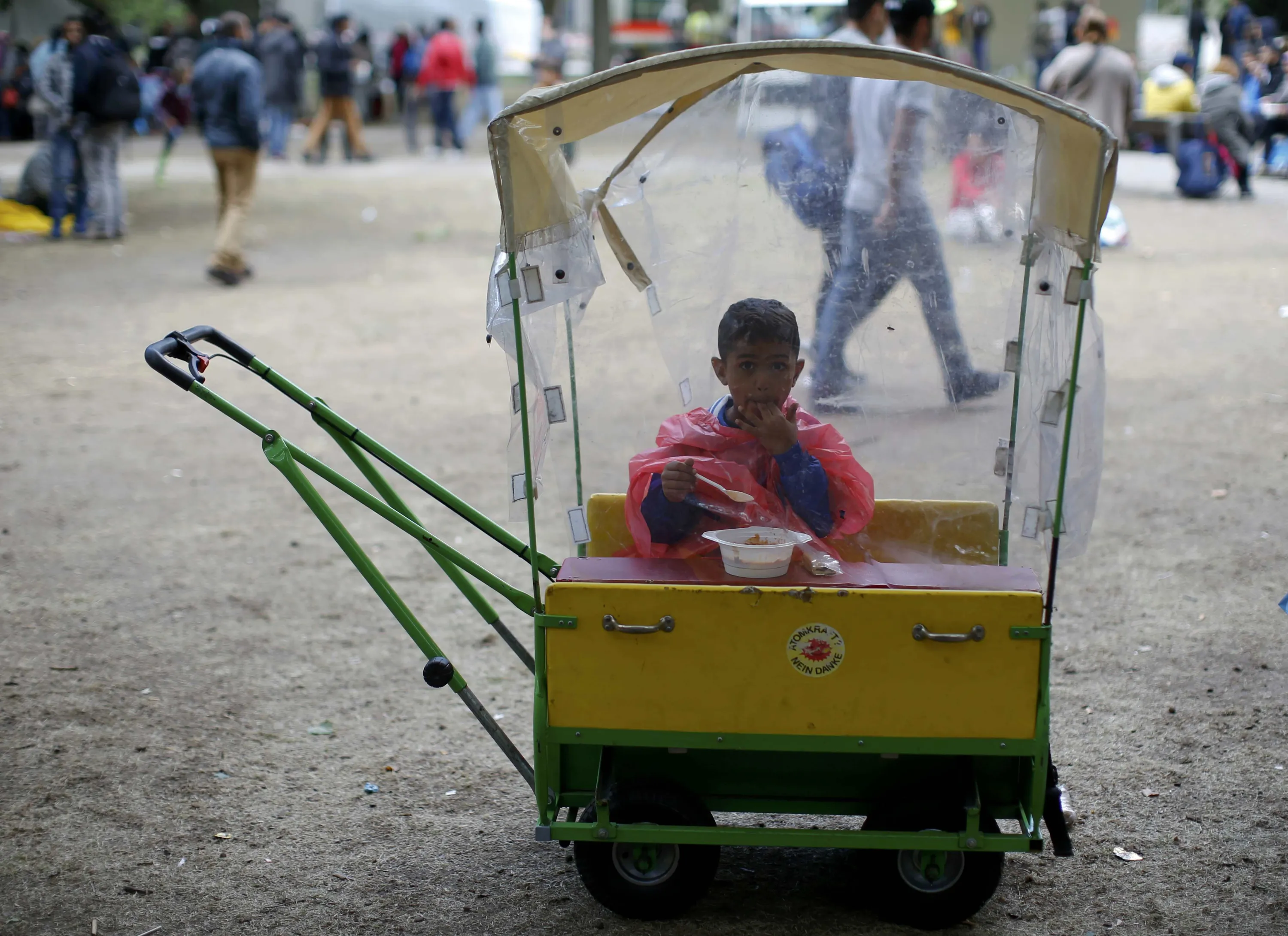 A migrant's child eats as he sits inside a vehicle at a compound outside the Berlin Office of Health and Social Affairs (LaGeSo) in Berlin, Germany September 7, 2015. About 2,500 refugees are expected to arrive in Germany via Austria by early afternoon on Monday, after an estimated 20,000 came in over the weekend, a Bavarian official told reporters. (Photo by Fabrizio Bensch/Reuters)