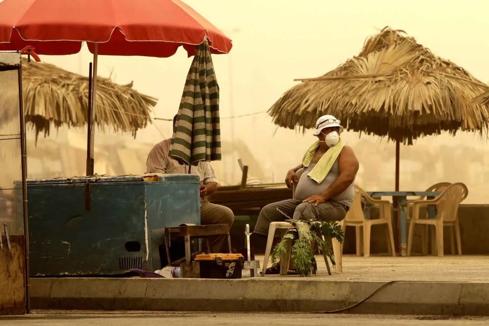 A Lebanese man wears a mask to protect himself from the dust as a sandstorm blows over the northern Lebanese city of Tripoli on September 8, 2015. (Photo by Ibrahim Chalhoub/AFP Photo)