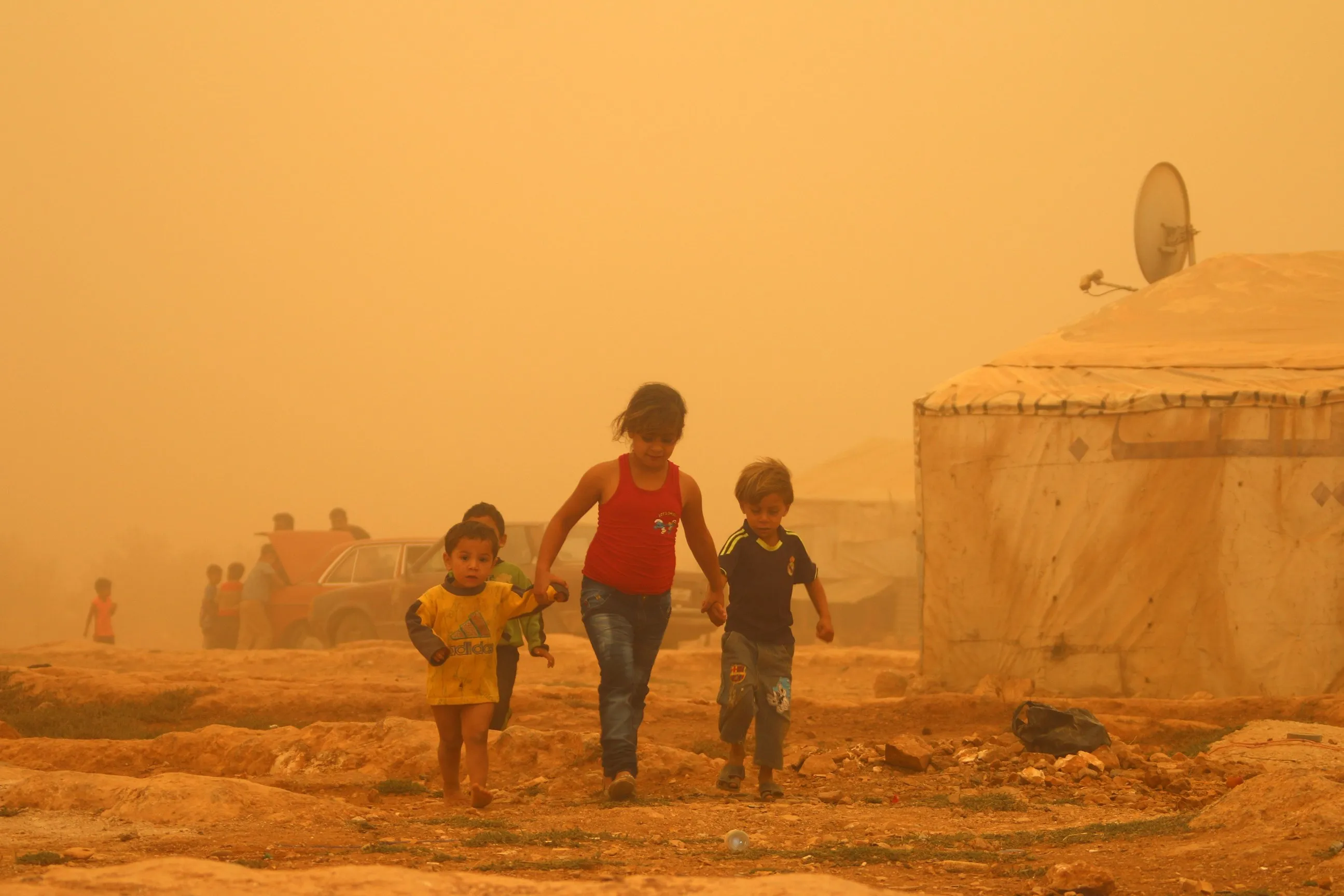 Syrian children walk amid the dust during a sandstorm on September 7, 2015 at a refugee camp on the outskirts of the eastern Lebanese city of Baalbek. (Photo by AFP Photo/Stringer)