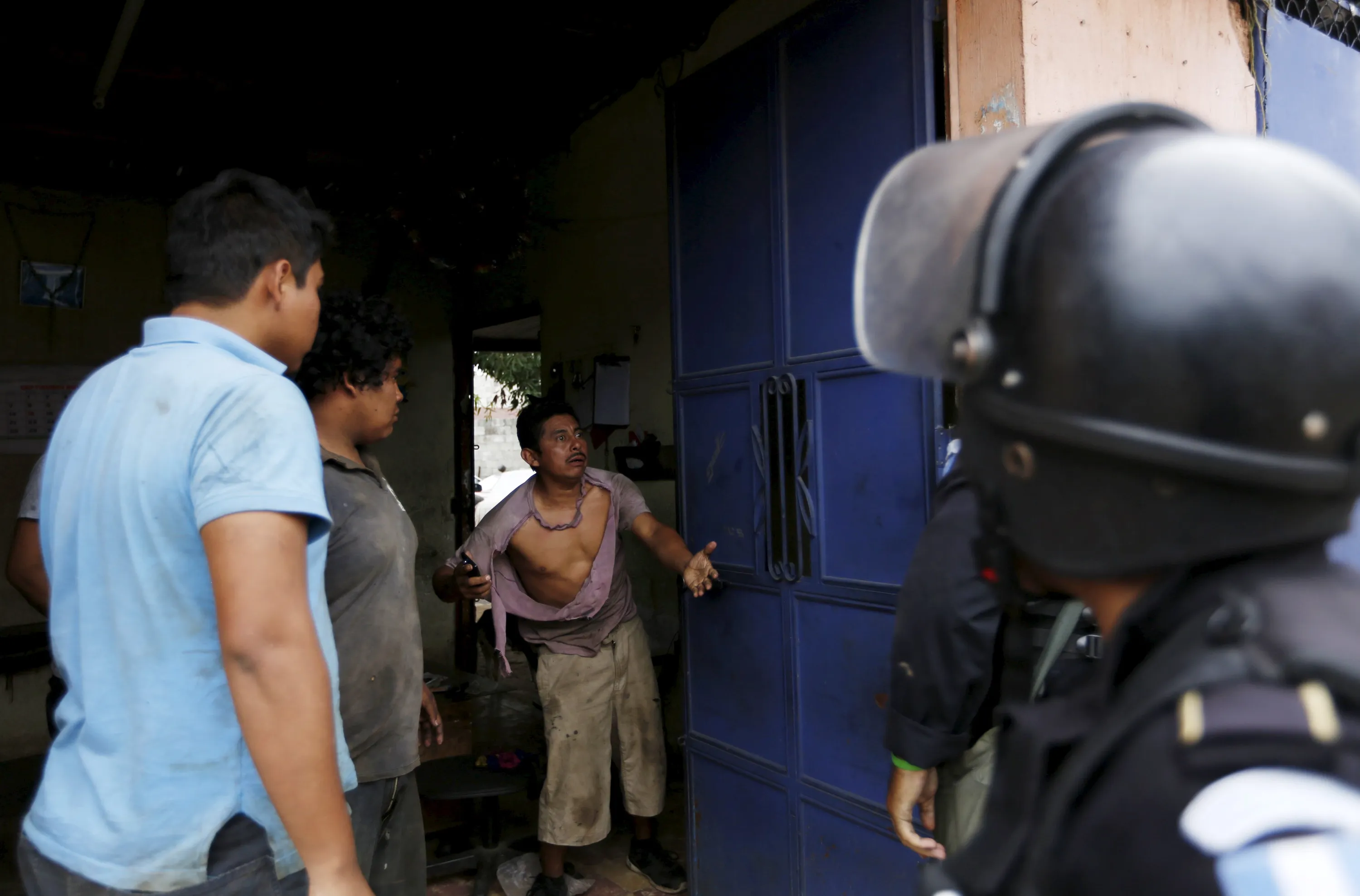 A man talks to a riot police officer who is trying to detain him during a protest against the re-election of the city's mayor Rubelio Recinos of the Patriot Party in Barberena, northwest of Guatemala City, September 8, 2015. (Photo by Jorge Dan Lopez/Reuters)
