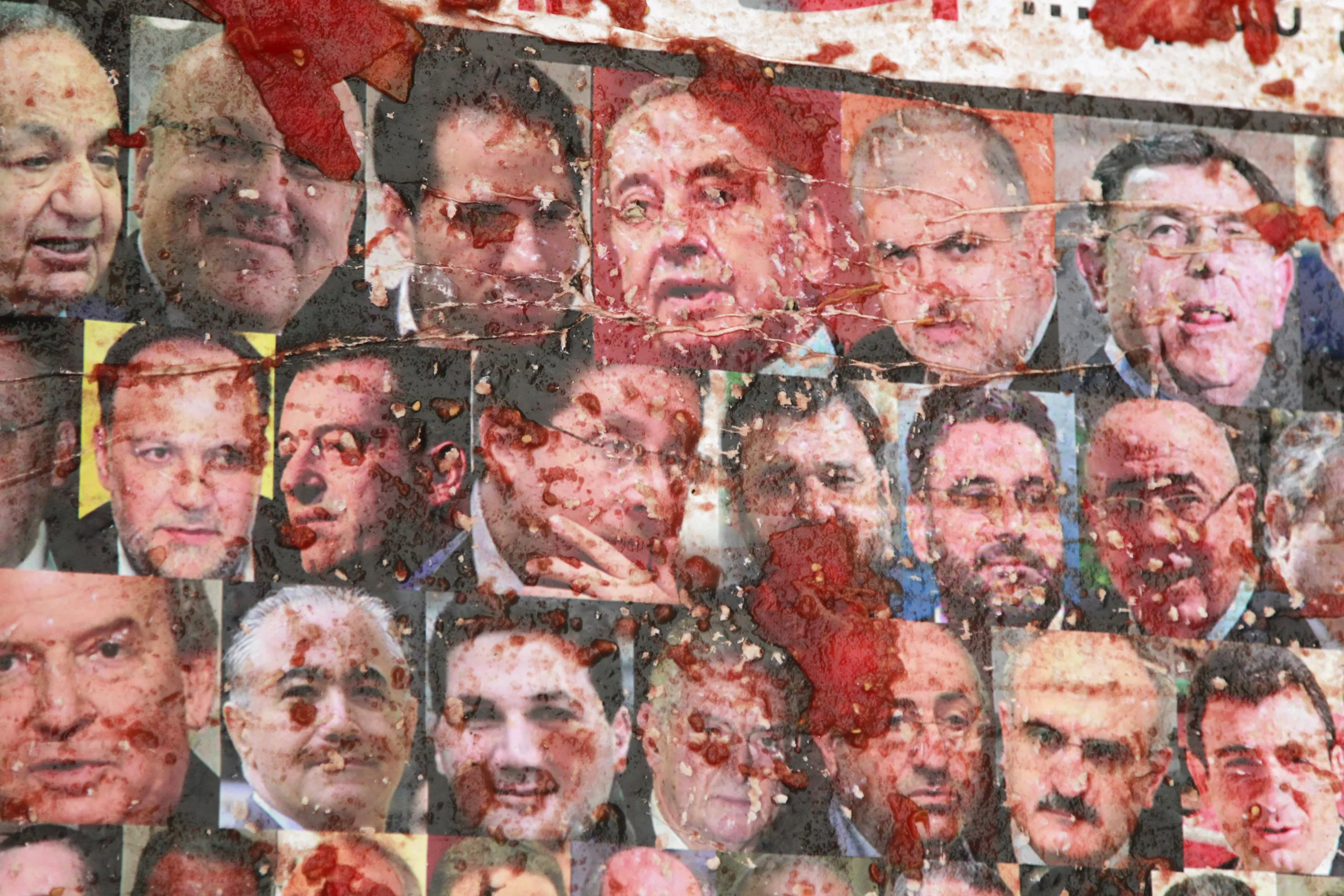 Crushed tomatoes are seen on a poster depicting pictures of Lebanese members of parliament during a protest against perceived government failures, including a rubbish disposal crisis, at Martyrs' Square in downtown Beirut, Lebanon September 9, 2015. (Photo by Aziz Taher/Reuters)