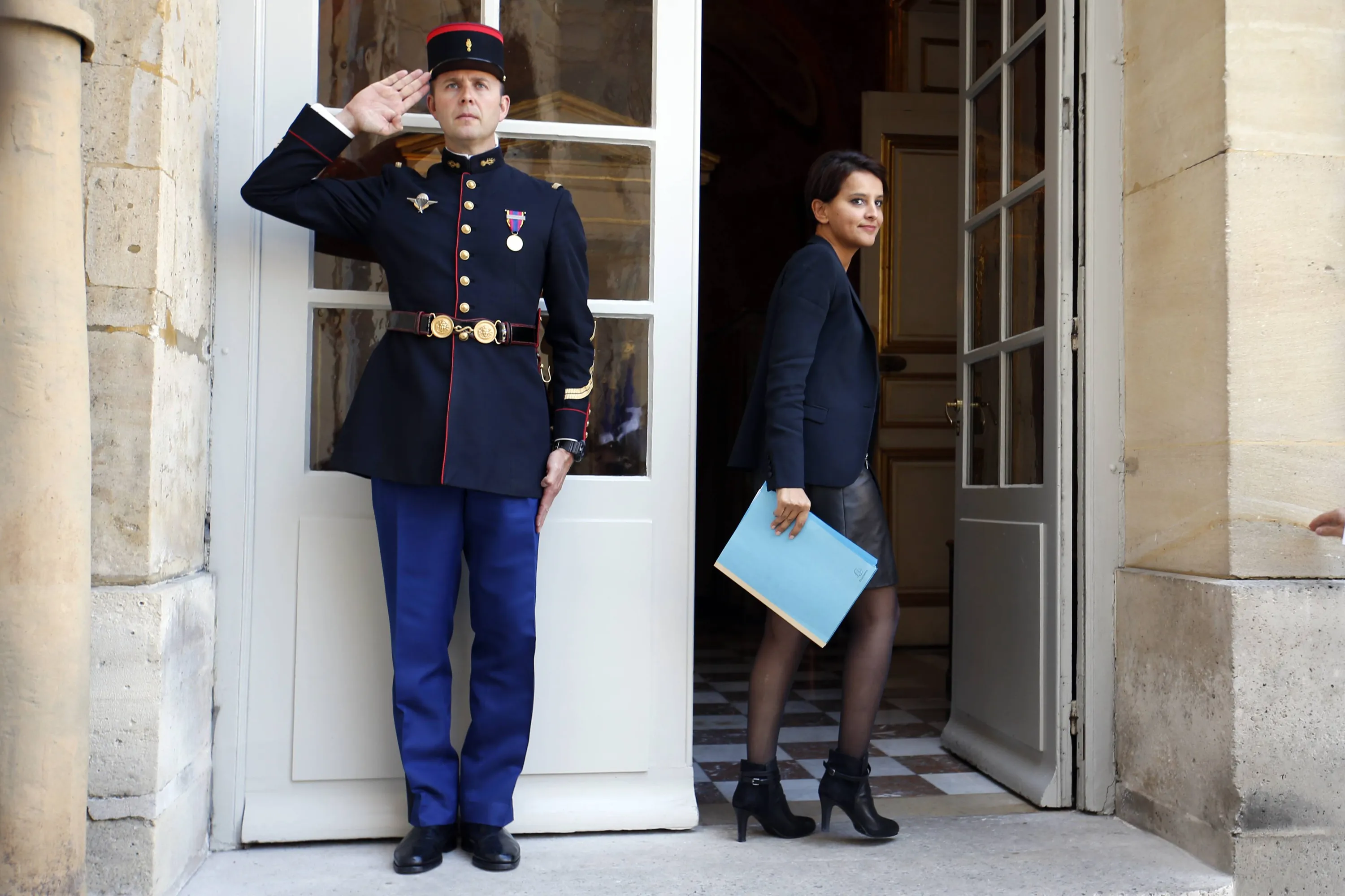 French Education minister Najat Vallaud-Belkacem (R) arrives to attend a meeting about hosting refugees in France, at the Hotel Matignon in Paris, September 9, 2015. (Photo by Charles Platiau/Reuters)