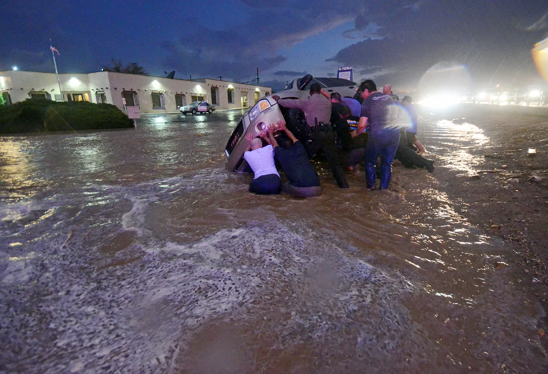 San Bernardino County Sheriff Department deputies and bystanders lift a vehicle where a man was believed to be trapped on Bear Valley Outerhighway South, Tuesday, September 8, 2015, in Hesperia, Calif. The man was swept into a storm drain and was found alive at Victor Valley College Lake in Victorville, Calif., The Victor Valley Daily Press reported. (Photo by David Pardo/The Victor Valley Daily Press via AP Photo)