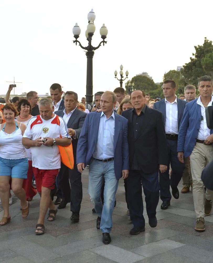 Russian President Vladimir Putin (3rd L, front) and former Italian prime minister Silvio Berlusconi (2nd R, front) walk along an embankment during their meeting in Yalta, Crimea, September 11, 2015. Berlusconi became the most prominent Western politician to visit Russian-annexed Crimea when he strolled beside the Black Sea on Friday with Putin. (Photo by Alexei Druzhinin/Reuters/RIA Novosti/Kremlin)
