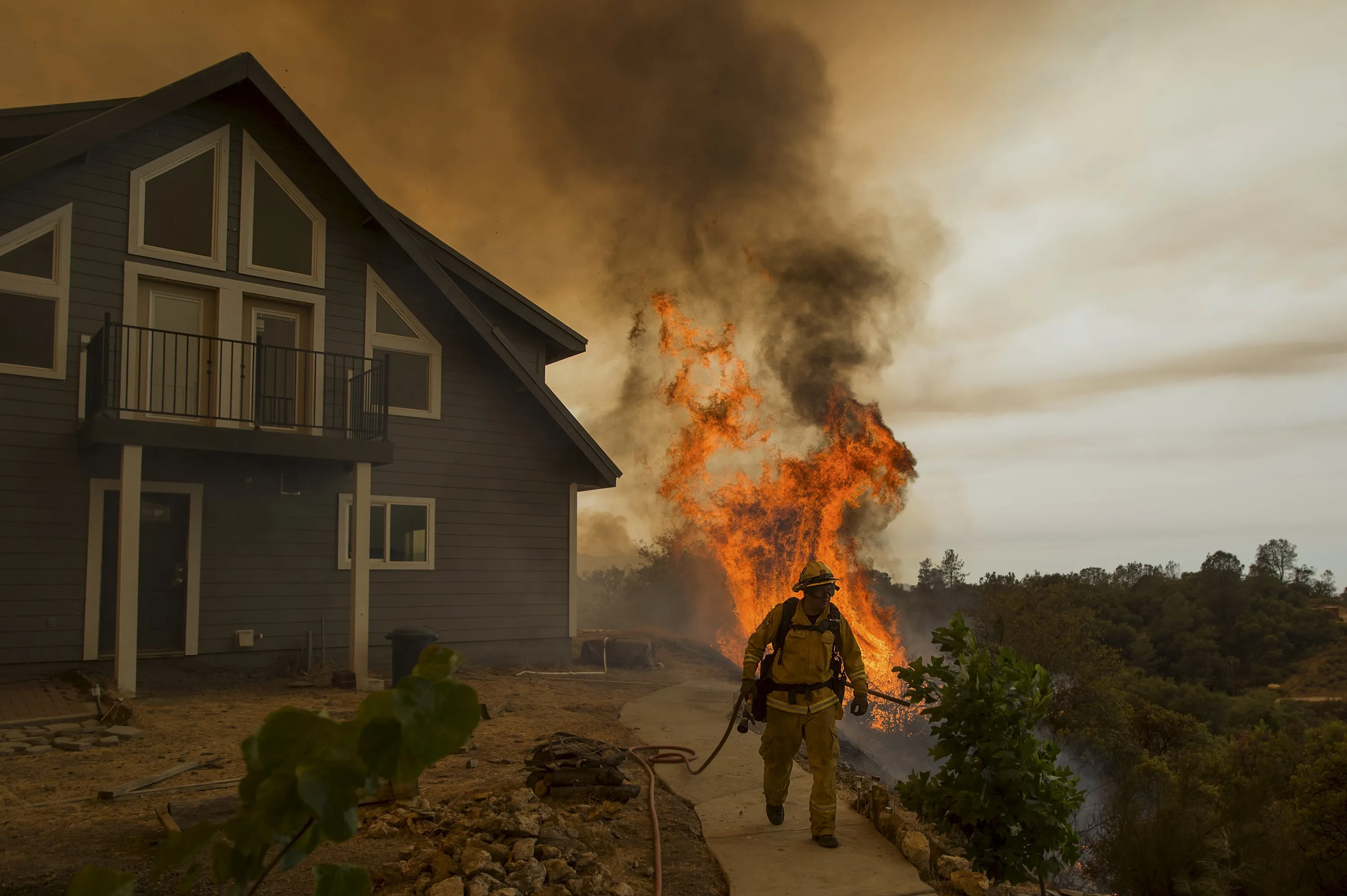 A firefighter works to save a residence as the Butte fire burns in San Andreas, California September 11, 2015. Evacuation orders were expanded to thousands of homes in northern California's Sierras on Friday as the rapidly spreading wildfire roared for a third day through drought-parched timber and brush, threatening mountain communities near Sacramento. By Friday, the flames had devoured nearly 32,000 acres of rugged terrain. (Photo by Noah Berger/Reuters)