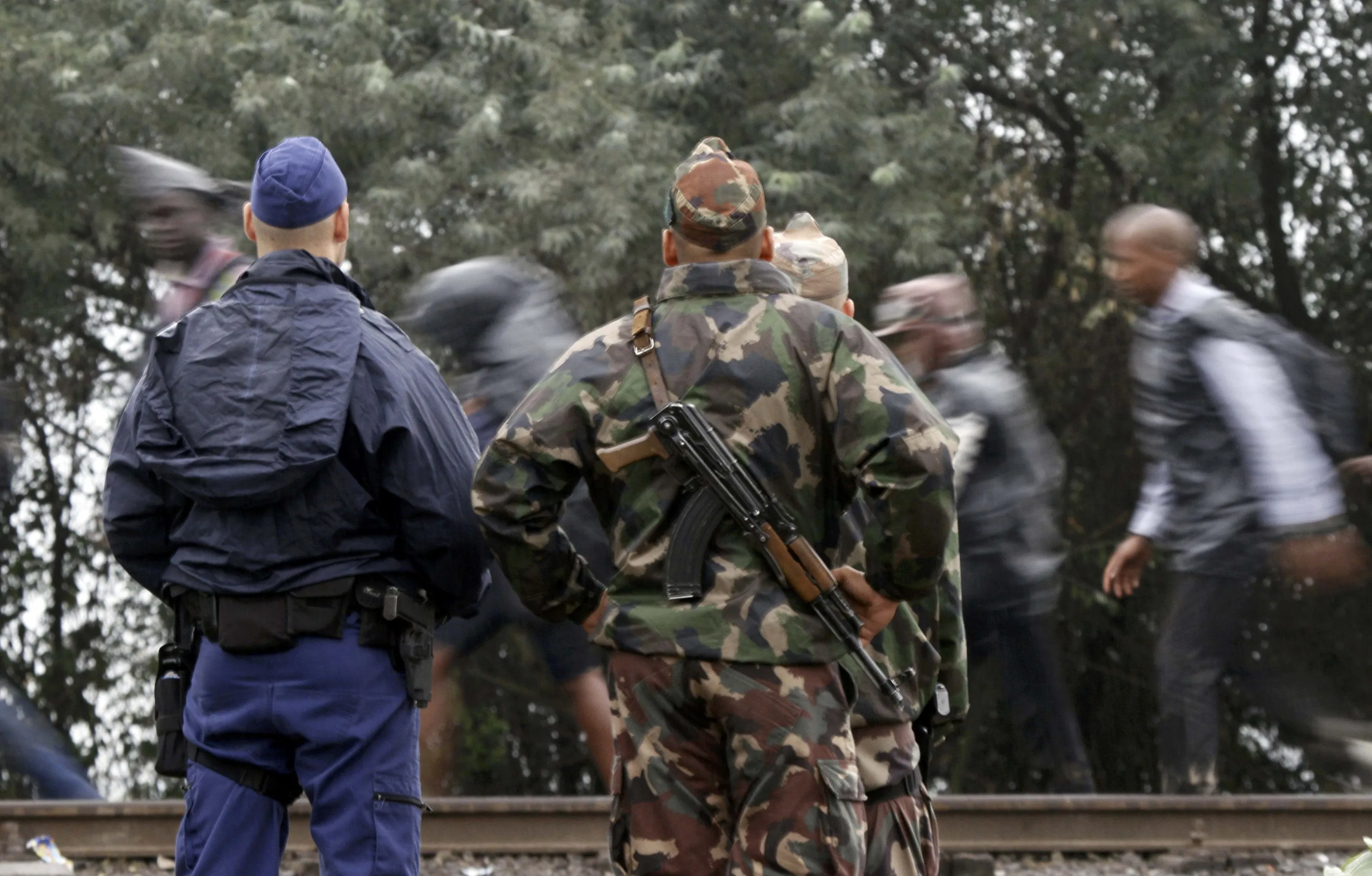 A police officer and an army soldier watch as people walk from Serbia to a migrant collection point in Roszke, Hungary September 11, 2015. Hungary said on Thursday it expected to finish building a fence along its border with Serbia by early October, and indicated it would call a “state of crisis” next week as the right-wing government readies a clampdown on migrants and refugees streaming through the Balkans. REUTERS/. (Photo by David Balogh/Reuters)