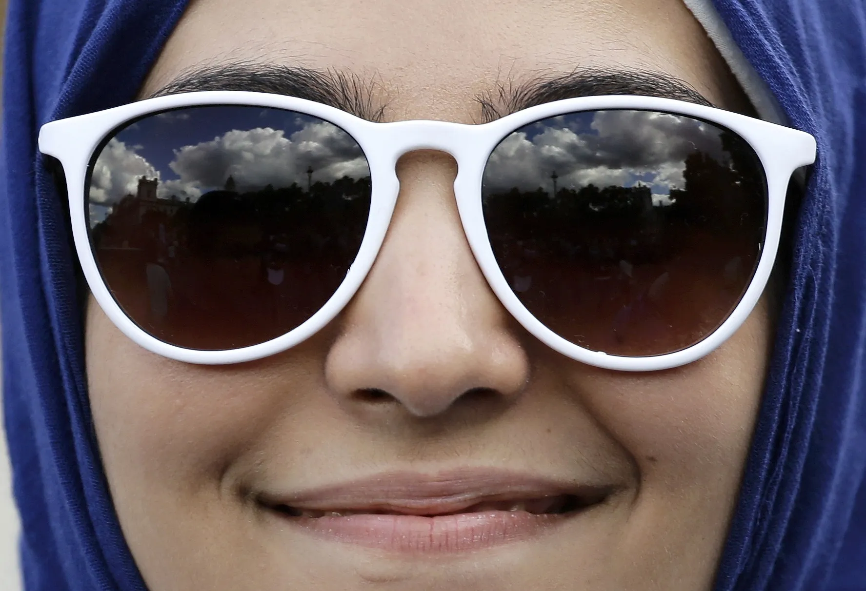 Blue sky and clouds are reflected in the sunglasses of a protester during a demonstration to express solidarity with migrants and to demand the government welcome refugees into Britain, in London, September 12, 2015. (Photo by Kevin Coombs/Reuters)