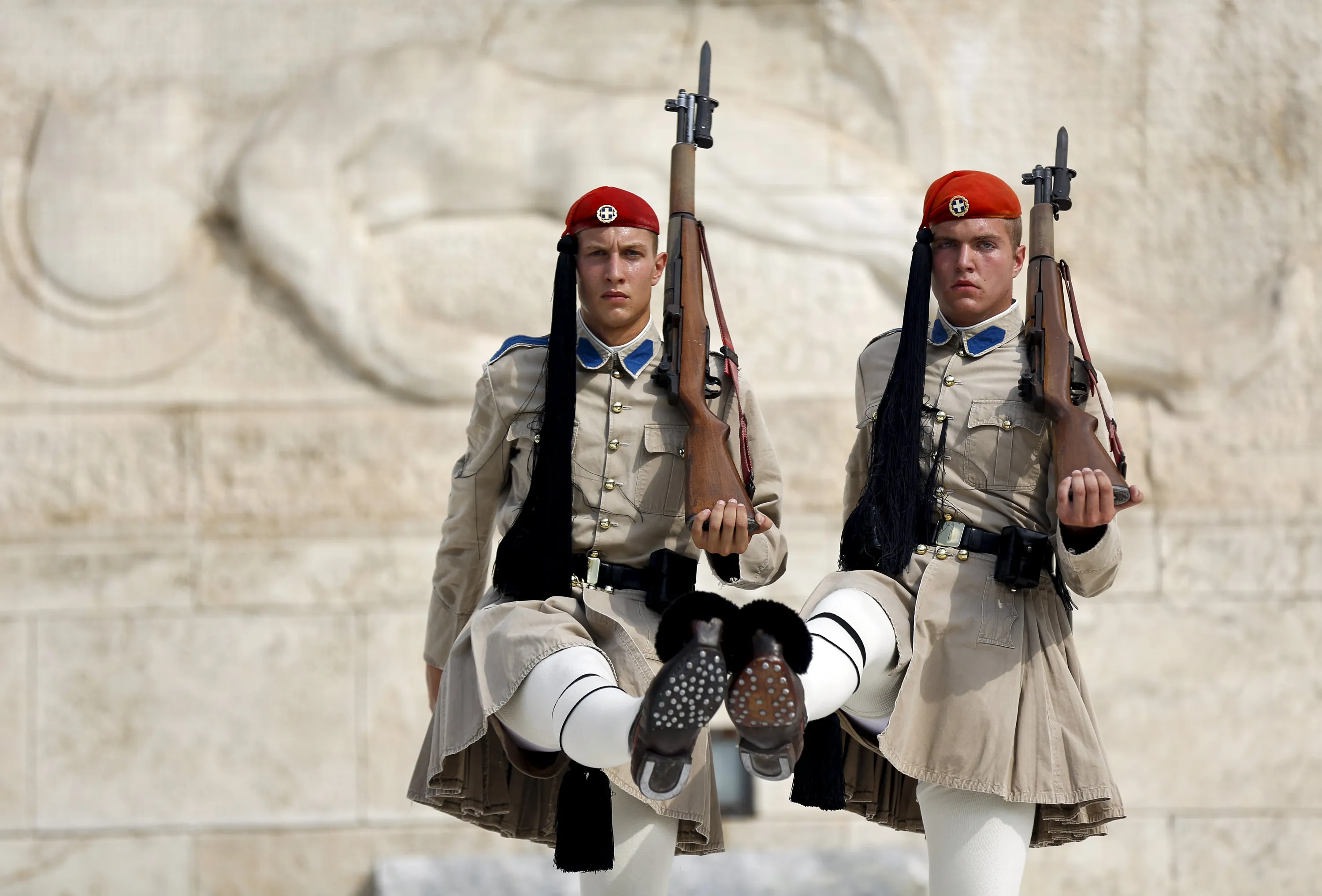 Greek presidential guards perform a ceremonial march at the Tomb of the Unknown Soldier in front of the parliament building in Athens, Greece, September 12, 2015. The leftist Syriza party of former Greek prime minister Alexis Tsipras maintained a wafer-thin pre-election lead over conservative New Democracy in three opinion polls on Saturday, with a fourth putting them level-pegging, ahead of the general elections to be held September 20. (Photo by Paul Hanna/Reuters)