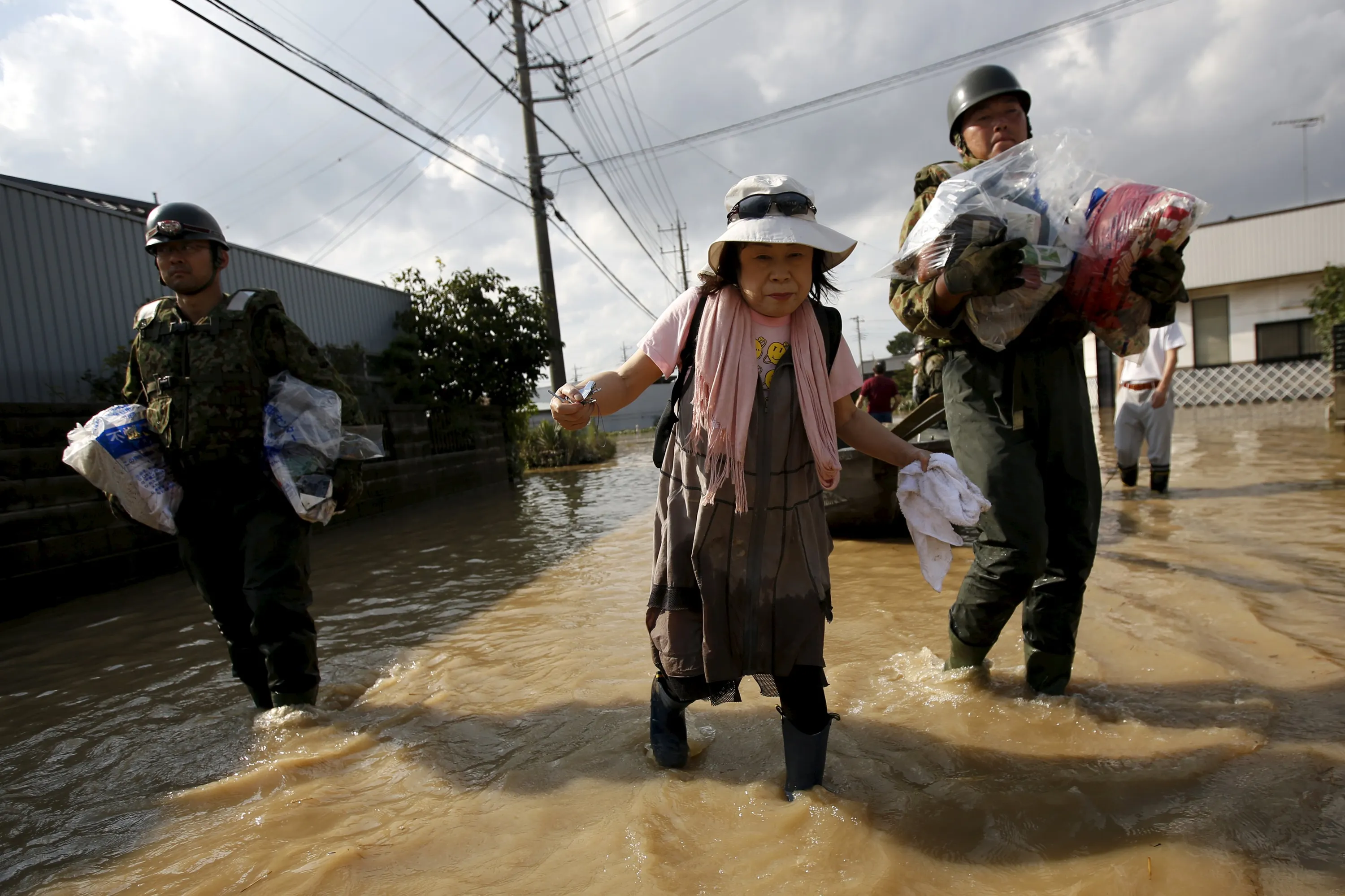 Local resident Yoshiko Nakamura (C), 66 years old, is escorted by Japanese Self-Defence Force's 1st Infantry Regiment soldiers as she is helped to leave from her home at a residential area flooded by the Kinugawa river, caused by Typhoon Etau in Joso, Ibaraki prefecture, Japan, September 12, 2015. (Photo by Issei Kato/Reuters)