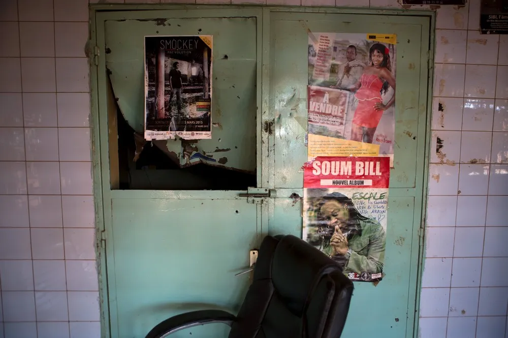 The damaged entrance of rapper and activist Smockey's recording studio, which according to neighbours was attacked by members of the presidential guard, is seen in Ouagadougou, Burkina Faso, September 17, 2015. General Gilbert Diendere, a shadowy spy master formerly the right-hand man to toppled President Blaise Compaore, seized power in Burkina Faso at the head of a military coup on Thursday (September 17), less than a month before elections meant to restore democracy in the West African state. (Photo by Joe Penney/Reuters)