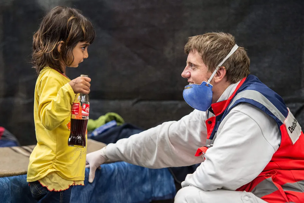 A volunteer from the German Red Cross plays with Zena, a little girl from Syria in an emergerncy shelter in Rottenburg, Germany, 16 September 2015. They are trying to active their German sim cards. In the night some 130 refugees were bought from Essling and a 140 more from Karlsruhe state processing centre were brought to the emergency accommodation. (Photo by Wolfram Kastl/EPA)