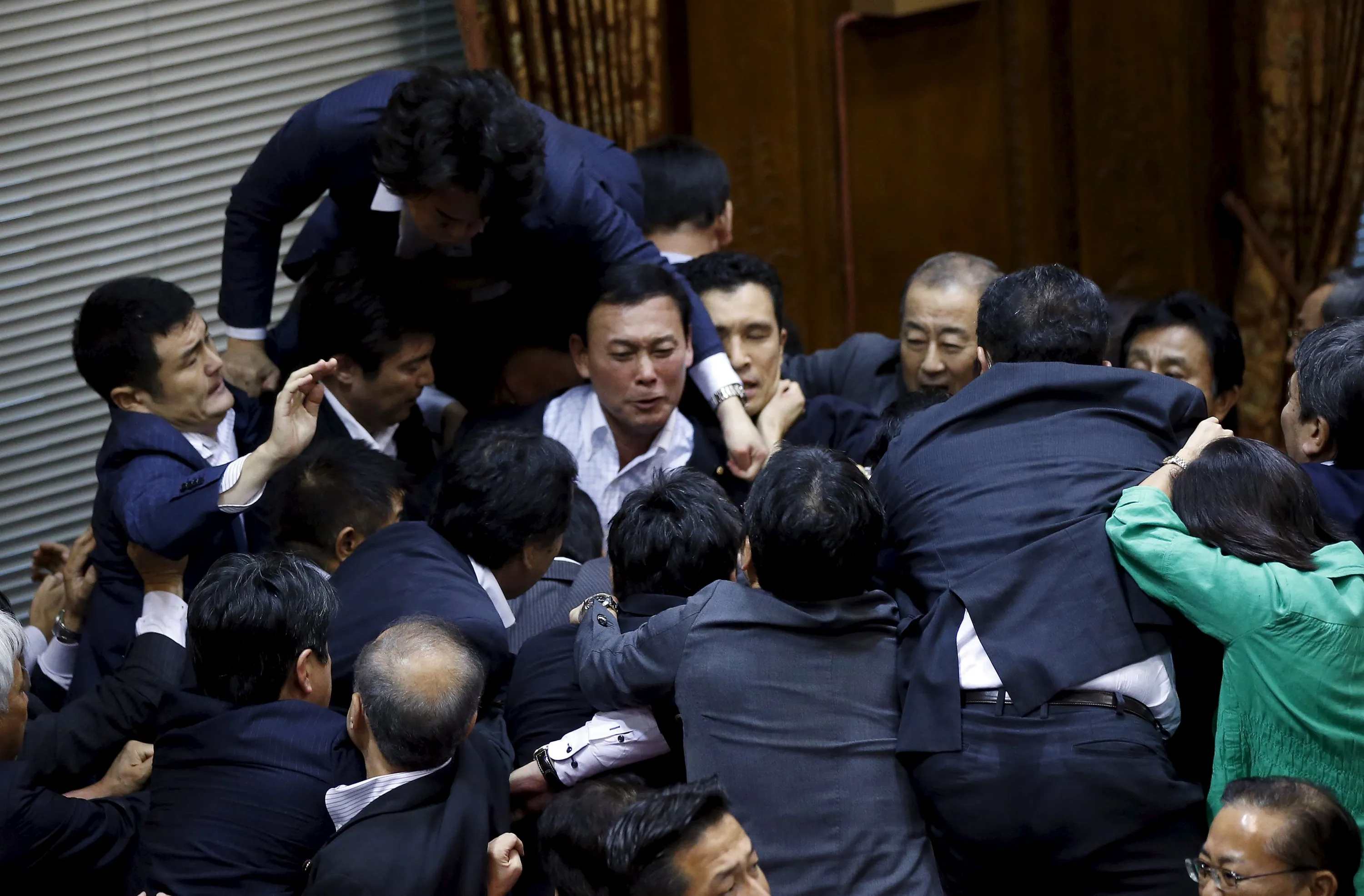 Opposition Democratic Party of Japan lawmaker Hiroyuki Konishi (top) climbs over other lawmakers who are guarding Yoshitada Konoike, chairman of the upper house special committee on security, before a vote at an upper house special committee session on security-related legislation at the parliament in Tokyo, Japan, September 17, 2015. A panel in Japan's upper house on Thursday approved legislation for a security policy shift that would allow troops to fight abroad for the first time since World War Two, a ruling party lawmaker said. (Photo by Toru Hanai/Reuters)