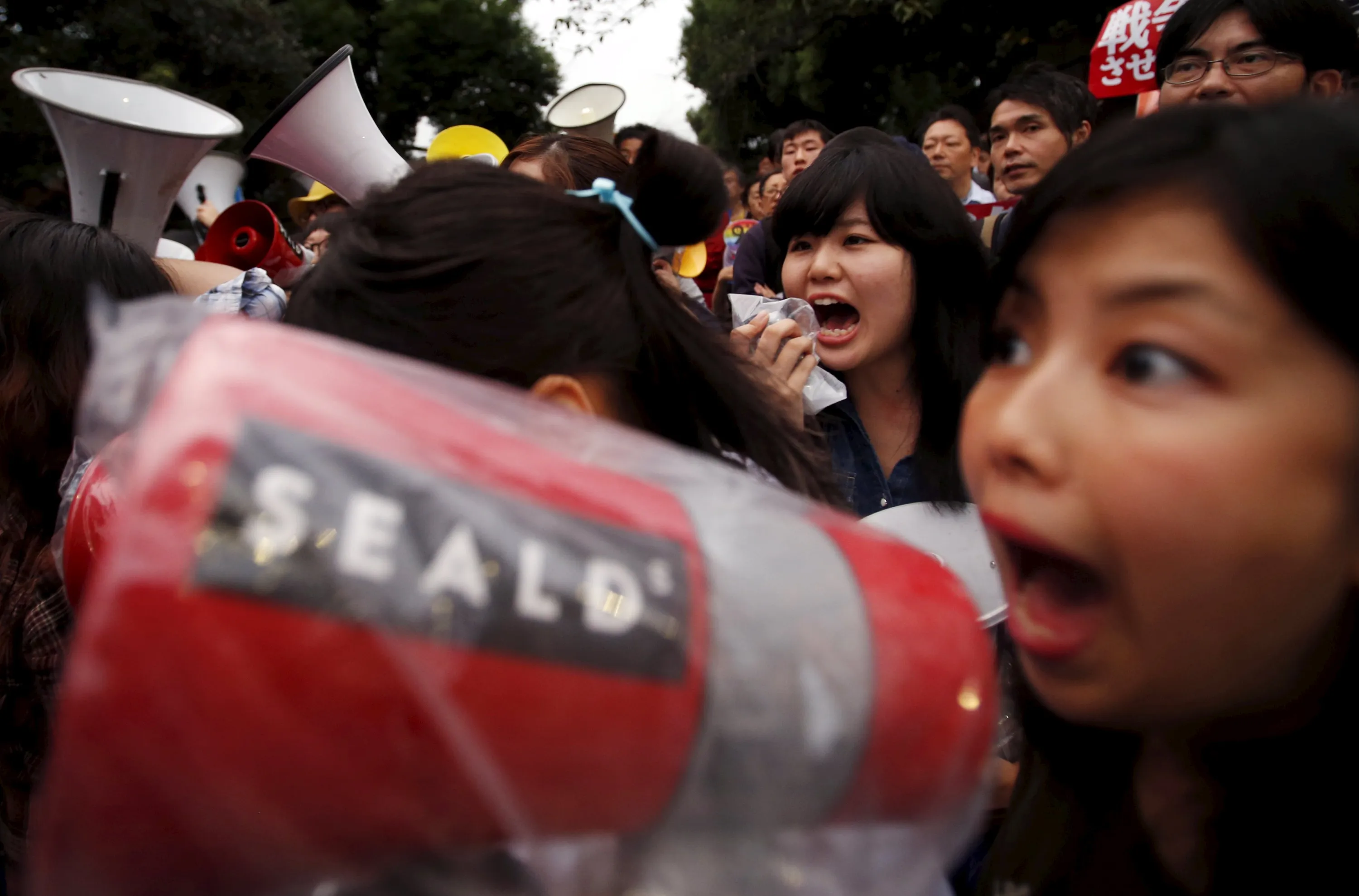 Members of protest group Students Emergency Action for Liberal Democracy (SEALDs), shout slogans during a rally against Japan's Prime Minister Shinzo Abe's security bill and his administration in front of the parliament in Tokyo, September 18, 2015. The Japanese government began a final push on Friday to enact contentious defence legislation that could let its troops fight overseas for the first time since World War Two, despite public protests and delaying tactics by the opposition. (Photo by Yuya Shino/Reuters)