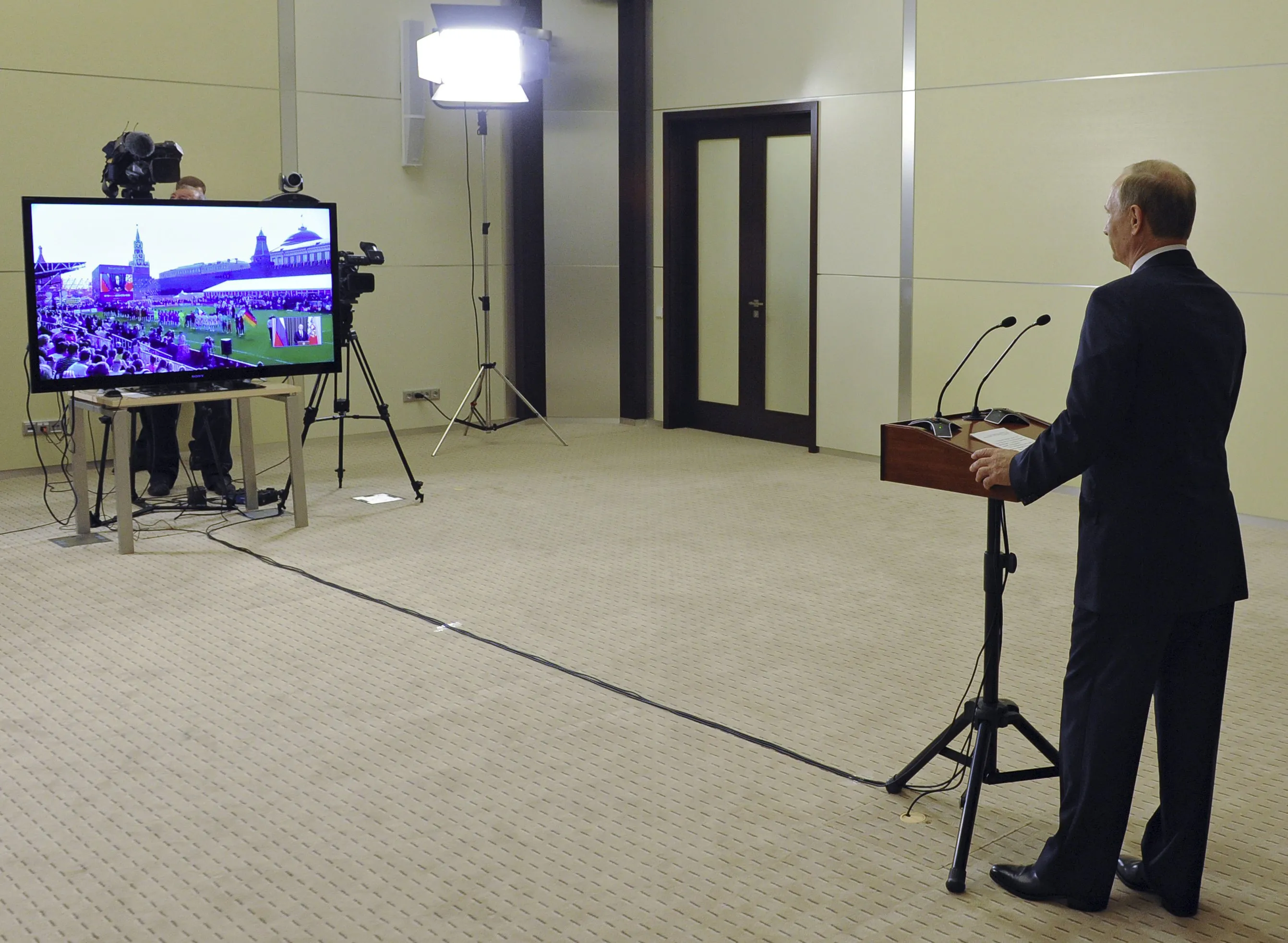 Russia's President Vladimir Putin delivers a speech as he takes part in a ceremony marking 1,000 days until the beginning of the 2018 FIFA World Cup in Red Square via a video link in Sochi, Russia, September 18, 2015. (Photo by Mikhail Klimentyev/Reuters/RIA Novosti/Kremlin)