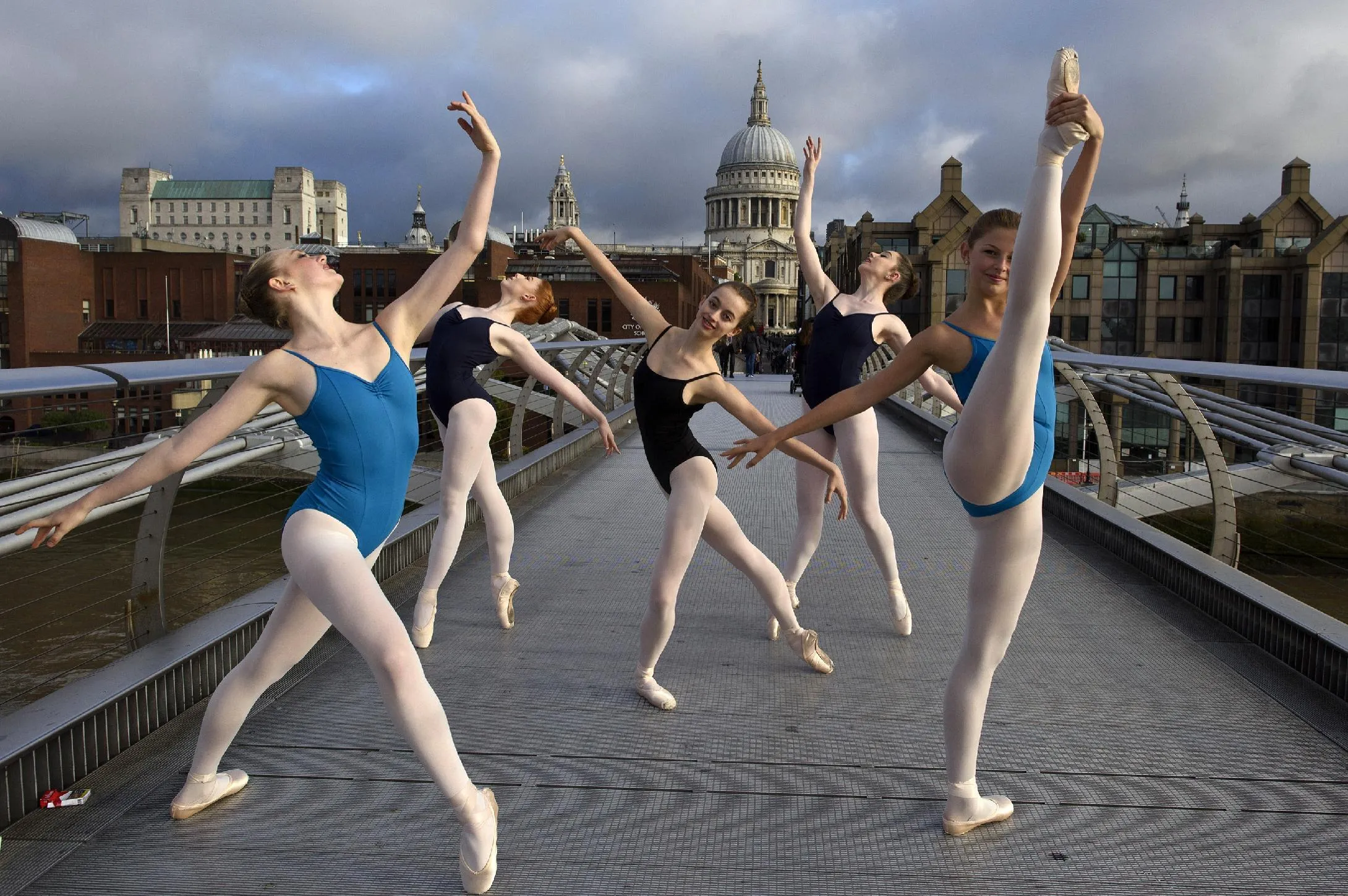 Candidates in the Royal Academy of Dance's Genee International Ballet Competition pose for photographs on Millennium Bridge on September 18, 2015 in London, England. 76 Dancers from 16 countries will take part in one of the world's most prestigious ballet competitions this weekend. The Genee International Ballet Competition returns to London where it first took place in 1931. (Photo by Ben Pruchnie/Getty Images)