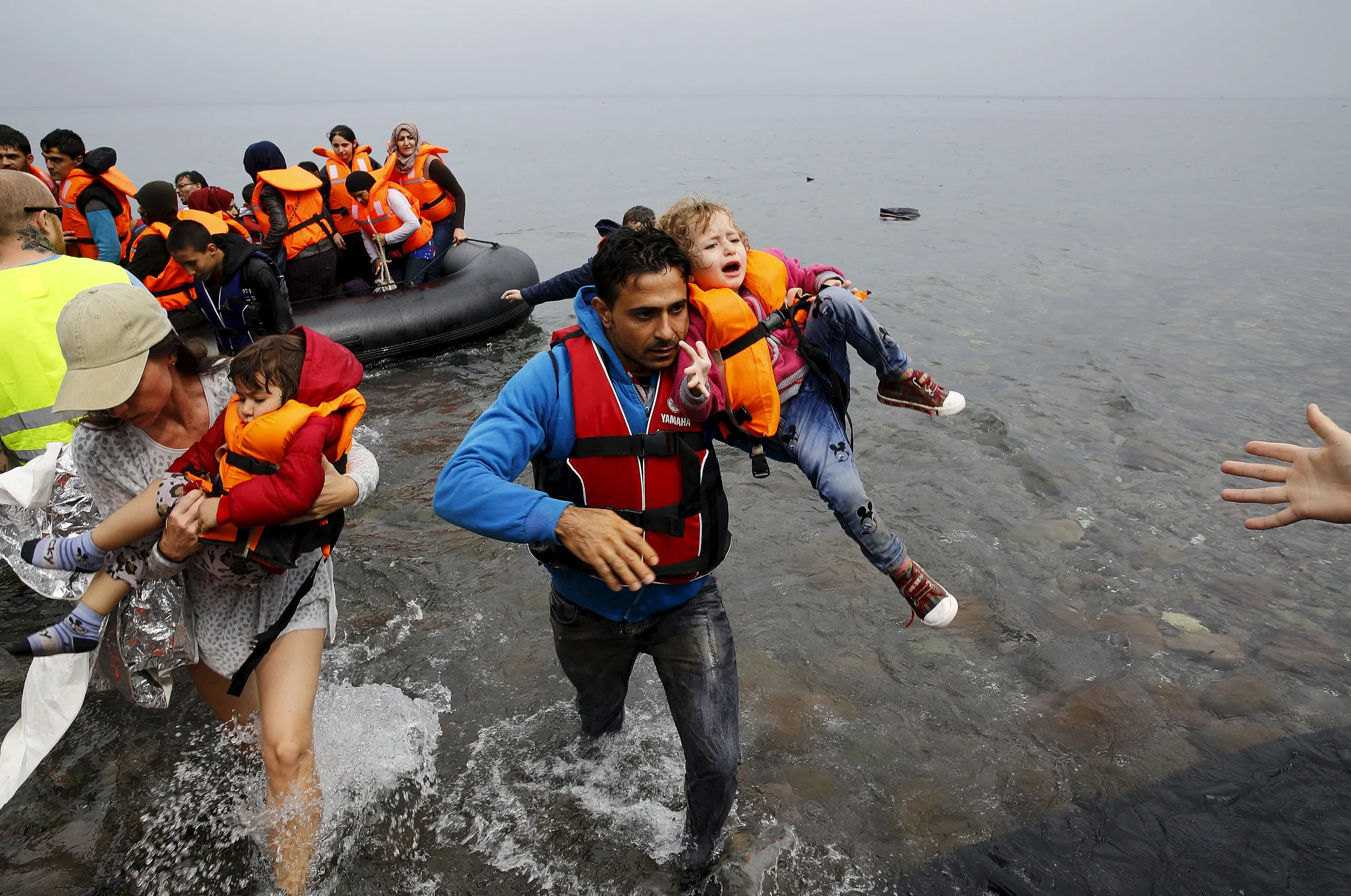 A volunteer helps Syrian refugee carry one of his two children off an overcrowded dinghy at a beach after crossing part of the Aegean Sea from Turkey to the Greek island of Lesbos September 23, 2015. (Photo by Yannis Behrakis/Reuters)
