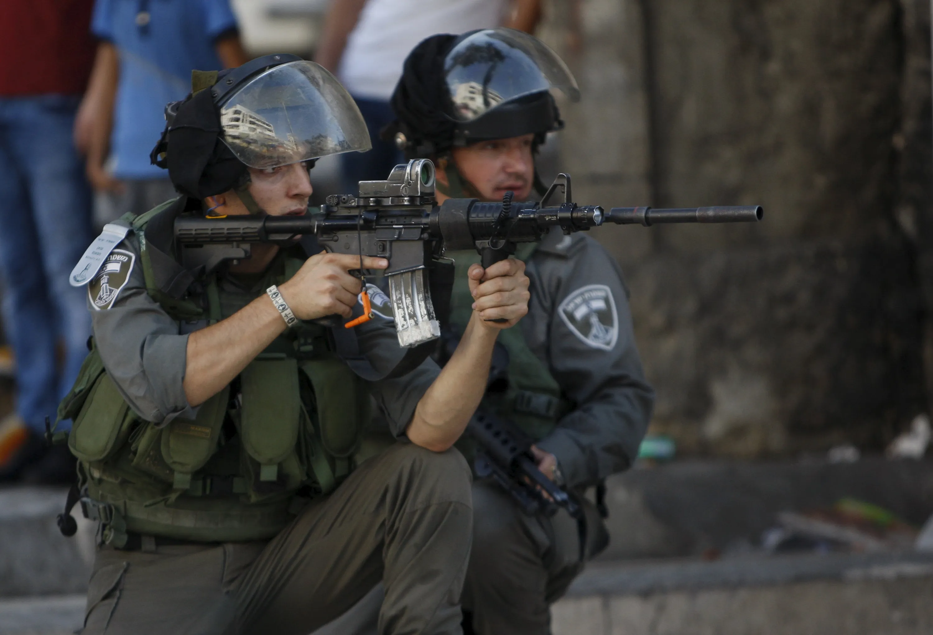 An Israeli border policeman aims his weapon at Palestinians during clashes following the funeral of 19-year-old Palestinian student Hadeel al-Hashlamun in the occupied West Bank city of Hebron September 23, 2015. (Photo by Mussa Qawasma/Reuters)