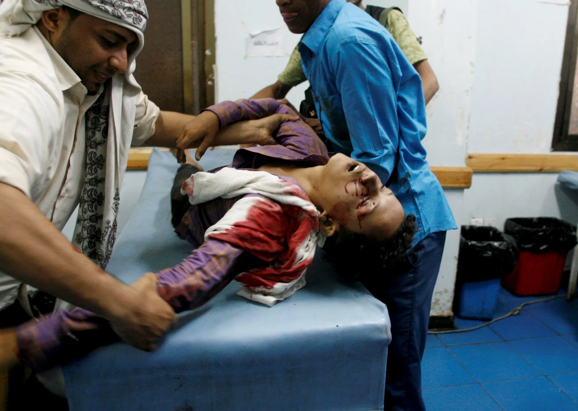Volunteers help a youth injured by a shell during fighting between pro-government militants and Houthi militia men in Yemen's southwestern city of Taiz September 29, 2015. (Photo by Reuters/Stringer)