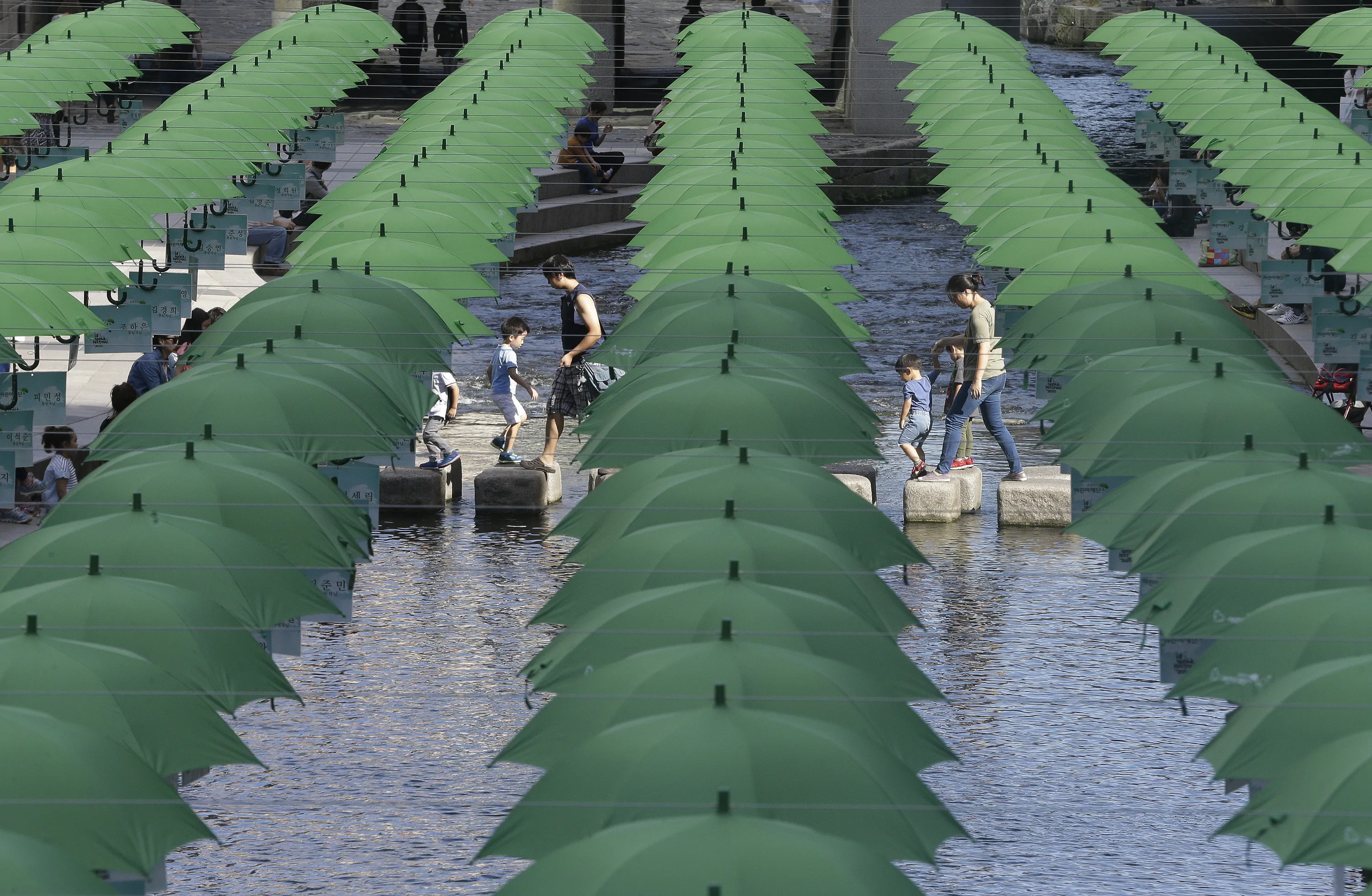 Visitors walk under umbrellas on display over Cheonggye stream during a campaign to raise donations to help underprivileged children in Seoul, South Korea, Tuesday, September 29, 2015. (Photo by Ahn Young-joon/AP Photo)