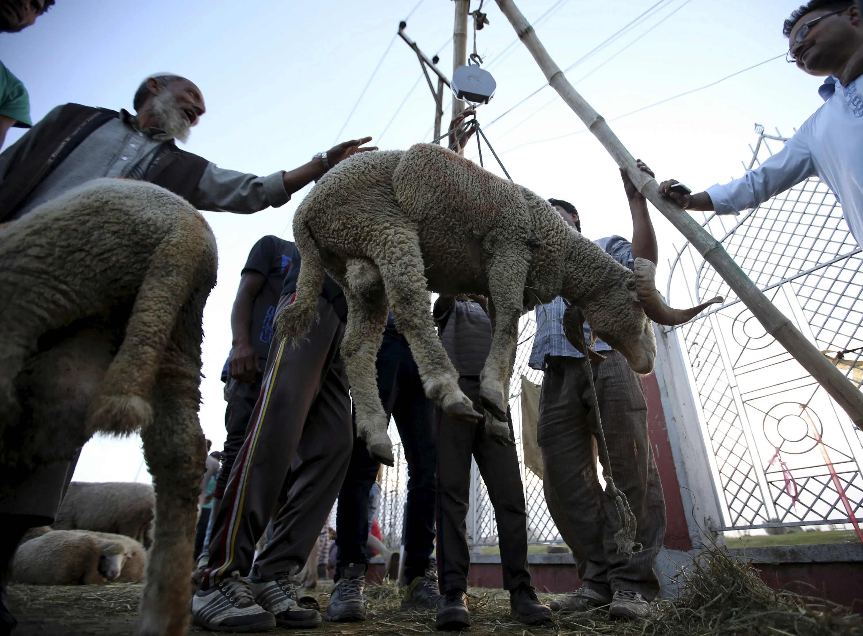 Kashmiri people weigh a sheep before selling it at a livestock market ahead of the Eid al-Adha festival in Srinagar September 23, 2015. (Photo by Danish Ismail/Reuters)