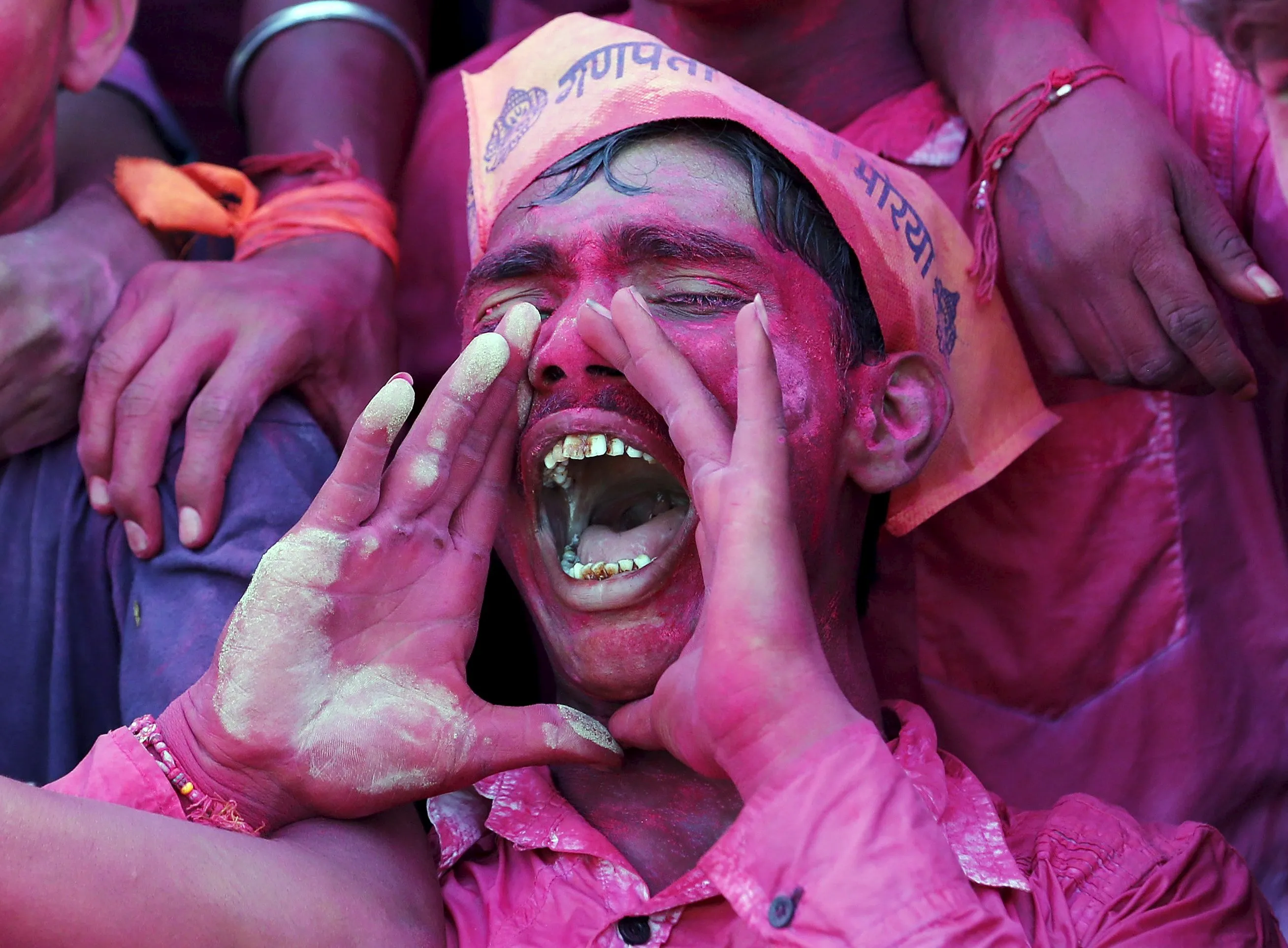 A devotee daubed in colour shouts religious slogans as he takes part in the immersion of an idol of the Hindu god Ganesh, the deity of prosperity, during the ten-day-long Ganesh Chaturthi festival in Ahmedabad, India, September 23, 2015. Ganesh idols are taken through the streets in a procession accompanied by dancing and singing, and later immersed in a river or the sea symbolizing a ritual seeing-off of his journey towards his abode, taking away with him the misfortunes of all mankind. (Photo by Amit Dave/Reuters)