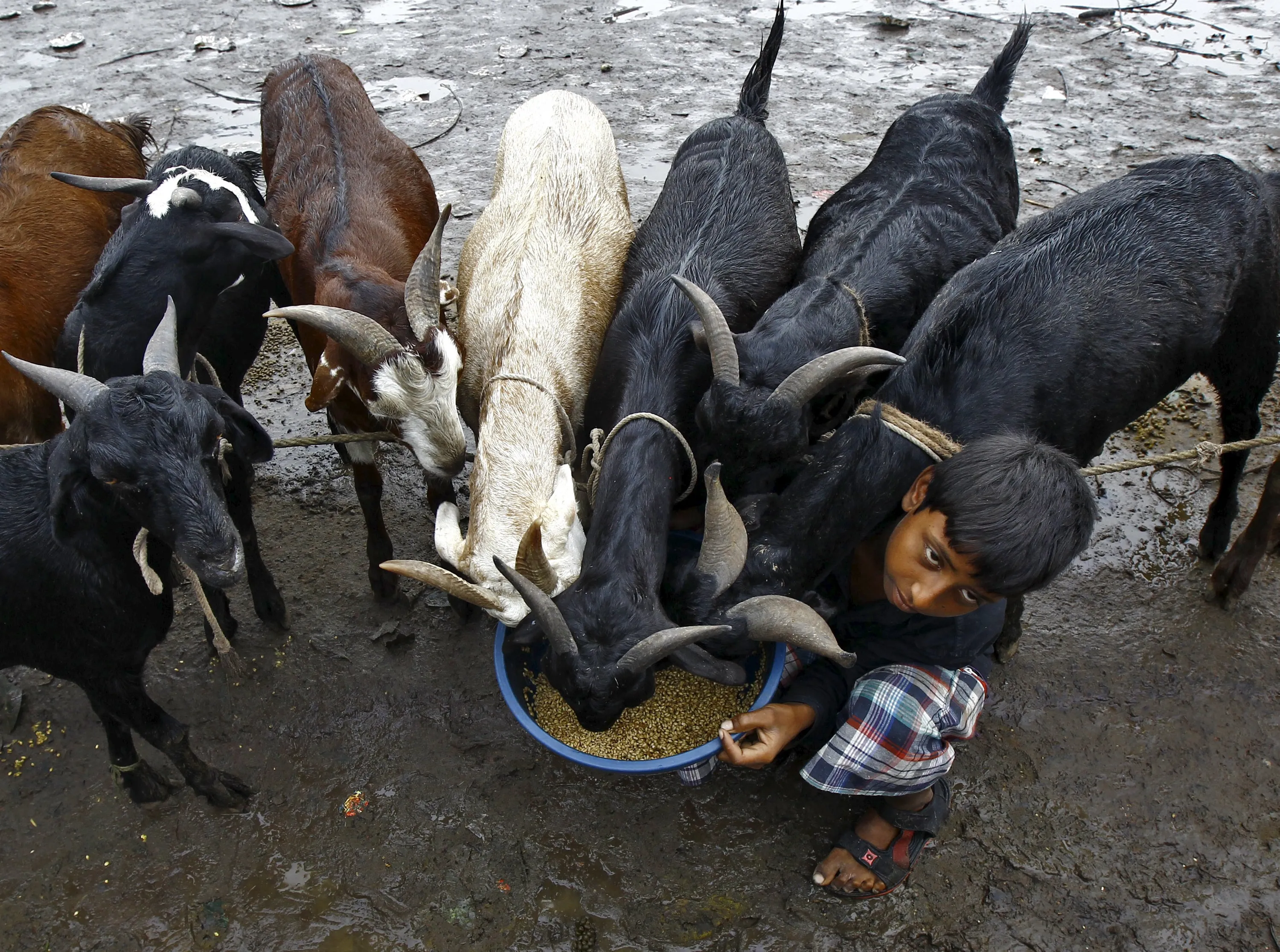 A boy feeds his goats as he waits for customers at a livestock market on the eve of the Eid al-Adha festival in Kolkata, India, September 24, 2015. (Photo by Rupak De Chowdhuri/Reuters)