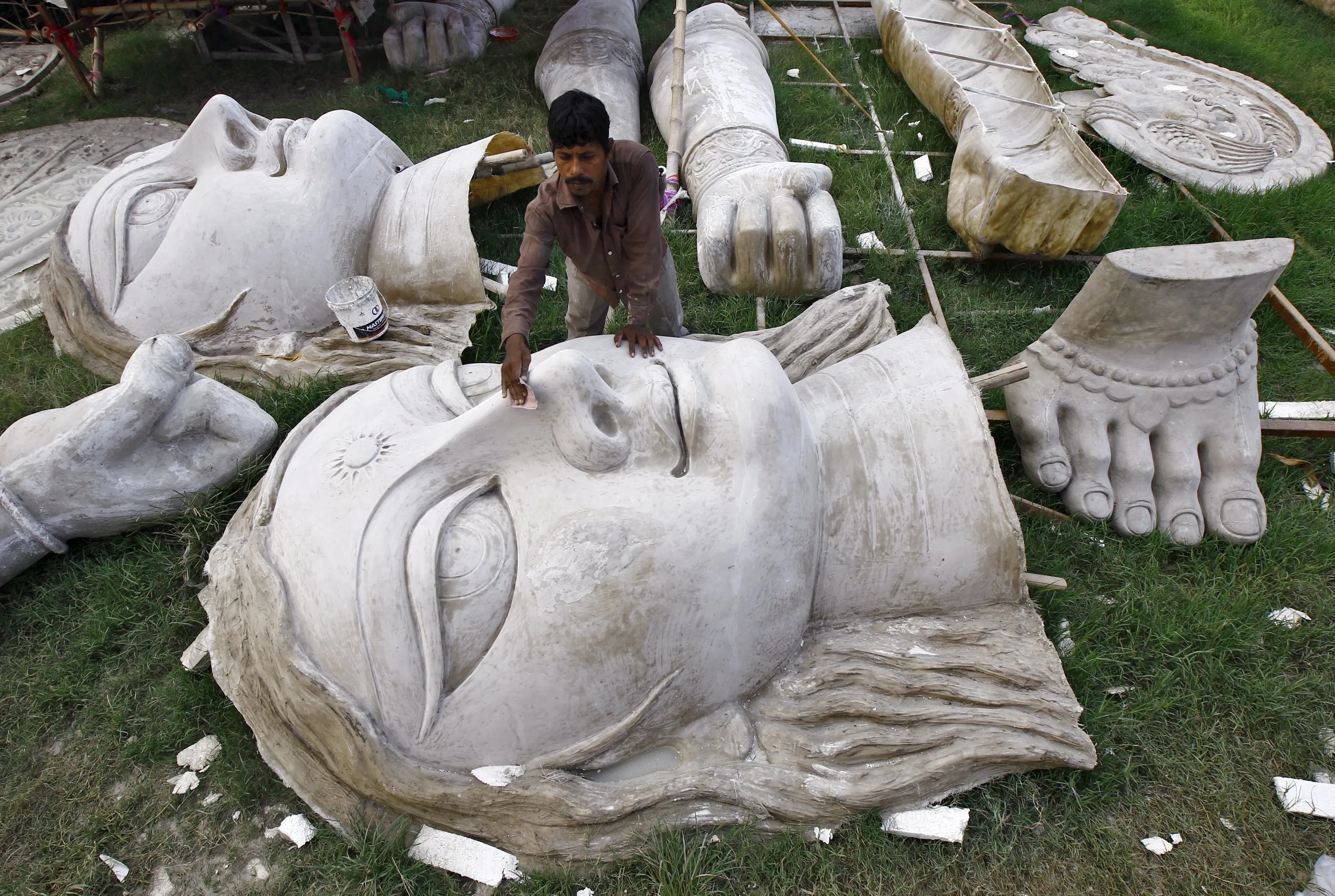 An artisan sandpapers an idol of the Hindu goddess Durga before applying paint on it ahead of the Durga Puja festival in Kolkata, India, September 30, 2015. The Durga Puja festival will be celebrated from October 19 to 22, which is the biggest religious event for Bengali Hindus. Hindus believe that the goddess Durga symbolises power and the triumph of good over evil. (Photo by Rupak De Chowdhuri/Reuters)