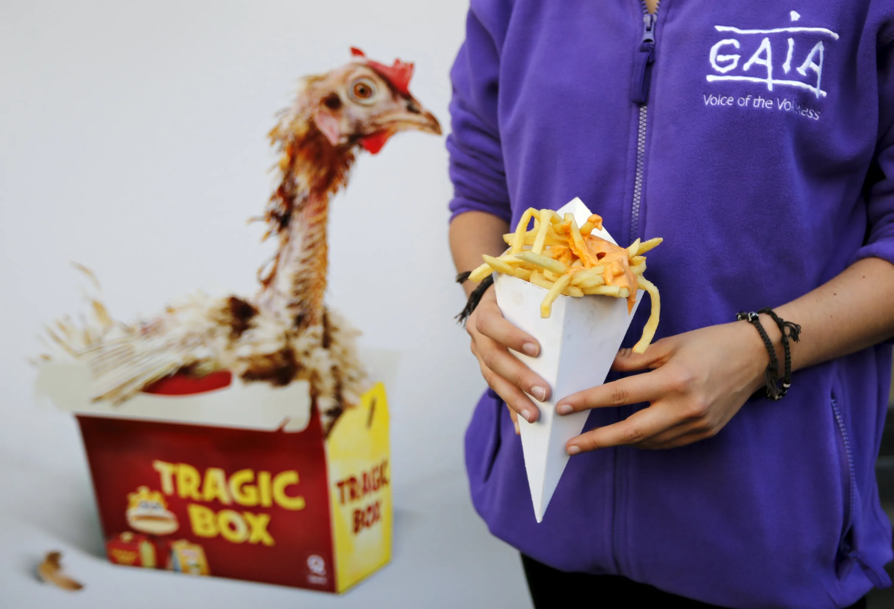 An animal rights activist poses with a cone of fries with sauce in front of a Quick fast food restaurant to protest what they say is the use of eggs coming from battery hens in the sauces of the restaurant, in Brussels, Belgium October 2, 2015. (Photo by Francois Lenoir/Reuters)