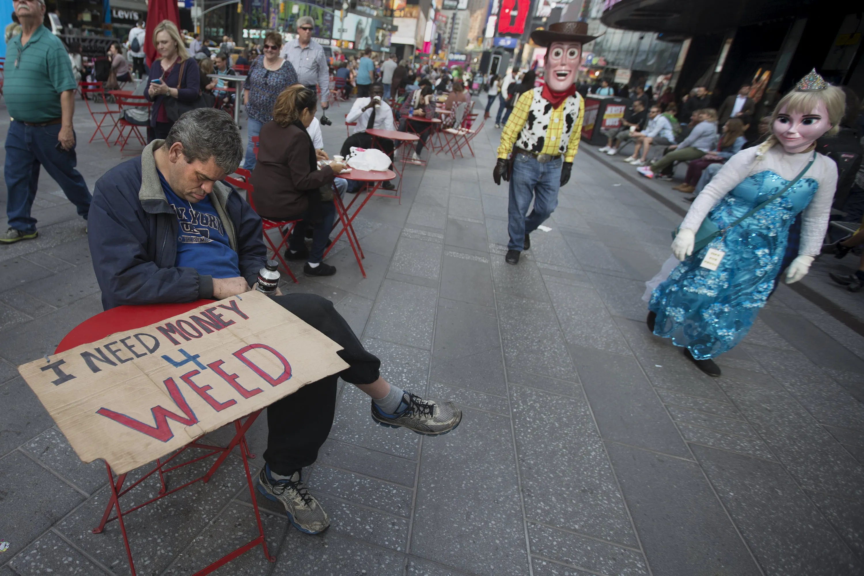 A man sleeps at a table with his "I need money 4 weed" sign as costumed characters walk past in Times Square in the Manhattan borough of New York October 8, 2015. (Photo by Carlo Allegri/Reuters)