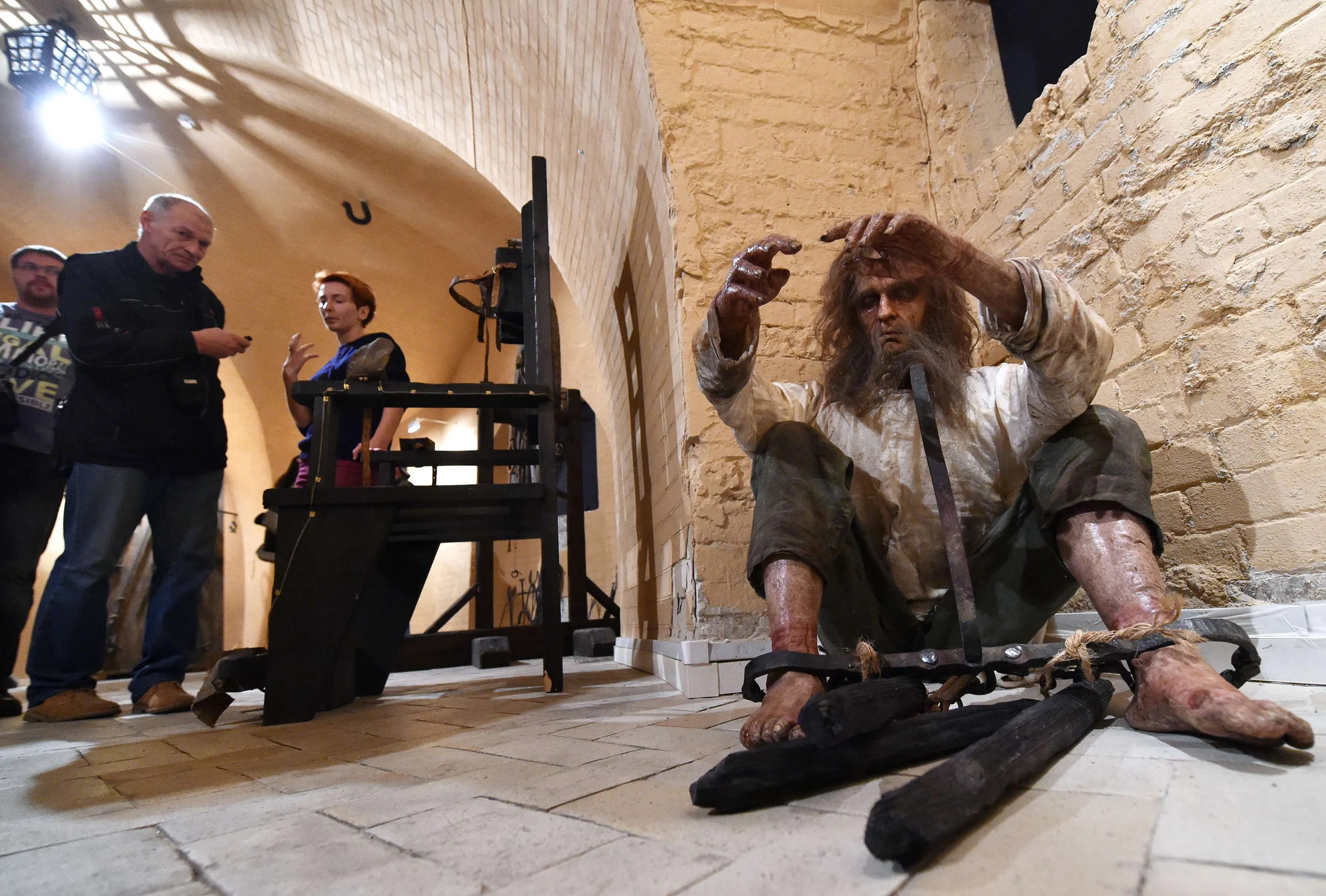 Visitors view an installation at the exhibition "Torture and Execution in the Middle Ages" during its opening in Kiev on October 7, 2015. (Photo by Sergei Supinsky/AFP Photo)