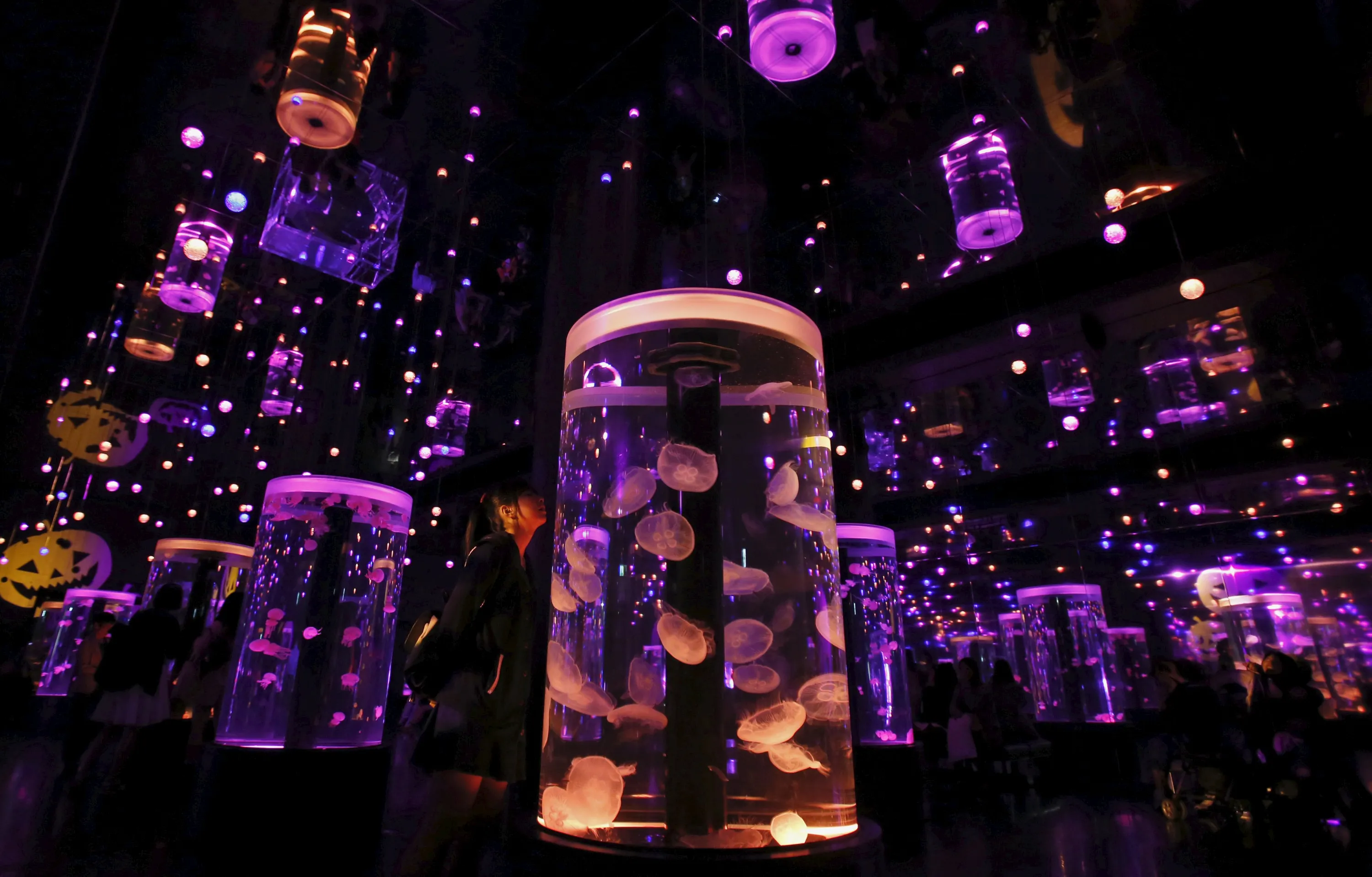 A visitor looks at jellyfish under special Halloween illumination during a seasonal event called Aqua Halloween at the Epson Aqua Park Shinagawa in Tokyo, Japan, October 10, 2015. (Photo by Yuya Shino/Reuters)