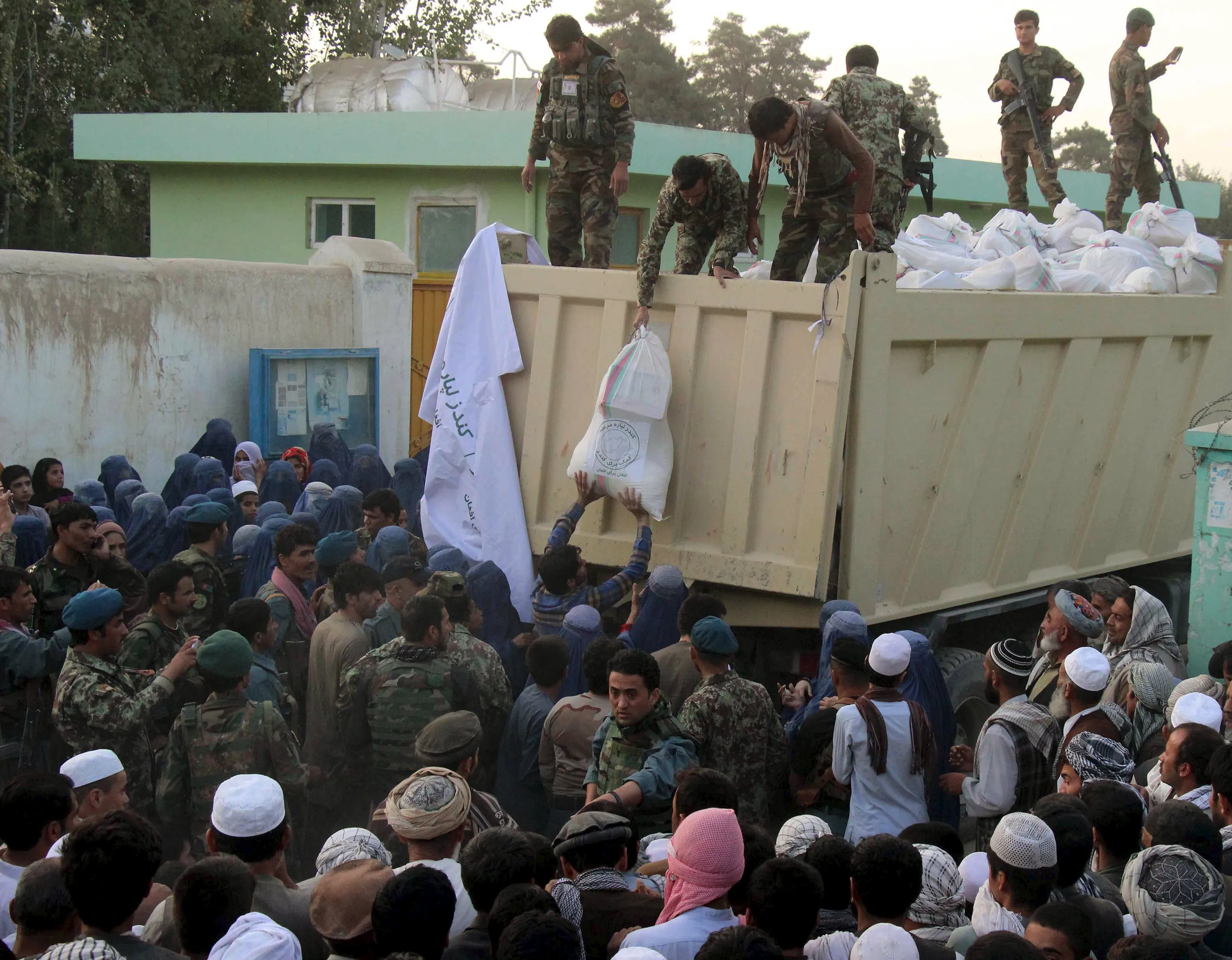Afghan National Army troops distribute aid to the civilians of Kunduz, Afghanistan October 14, 2015. The Taliban said they were pulling back in the northern city of Kunduz on Tuesday in order to protect civilians, but fighting continued elsewhere in the country with government troops battling to reopen the main highway south of the capital Kabul. (Photo by Reuters/Stringer)