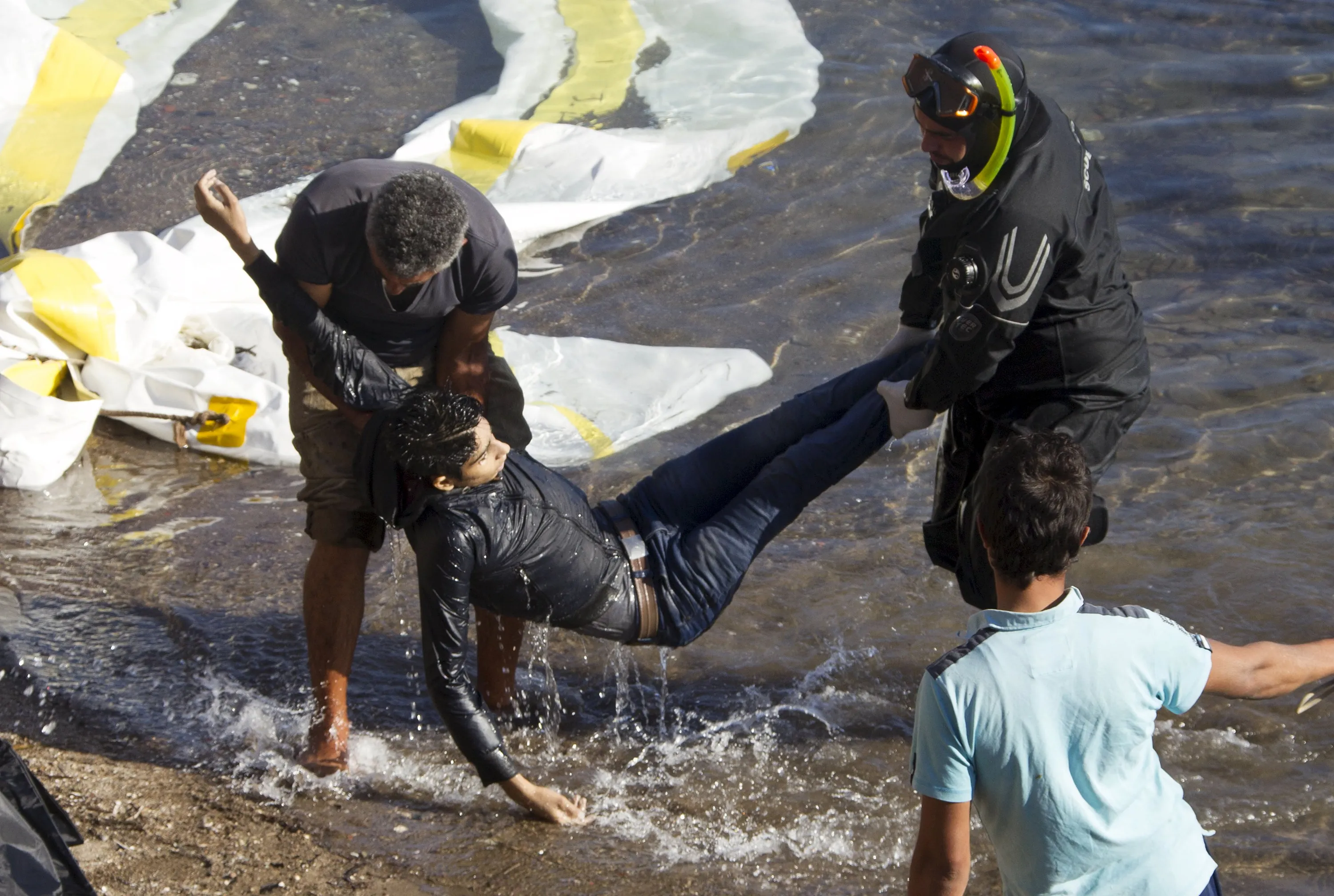 A Greek coast guard diver and a man carry the body of a refugee man at a beach as a local fisherman stand by on the Greek island of Lesbos October 15, 2015. Seven people drowned on Thursday, among them a baby and three children, after their wooden boat and a coast guard vessel crashed during a migrant rescue operation off the island of Lesbos, the Greek coast guard said. The boat, which the coast guard said was old, sank after the crash and 31 persons were rescued. A man, two women, three children and a baby had drowned, the coast guard said but did not provide further details on the incident or the nationality of the victims. (Photo by Giorgos Moutafis/Reuters)