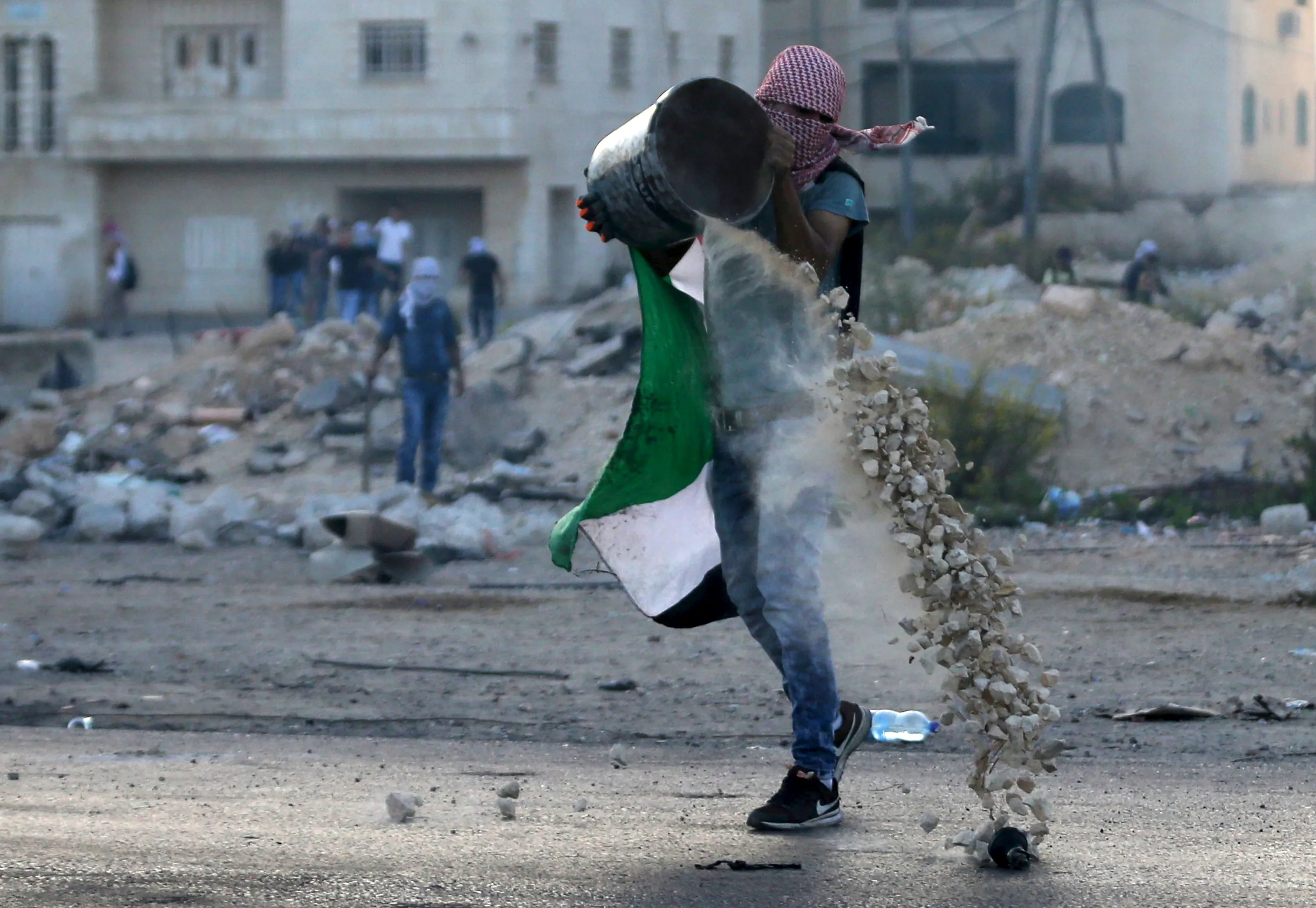 A Palestinian protester drops stones from a bucket to be hurled at Israeli troops during clashes near the Jewish settlement of Beit El, near the West Bank city of Ramallah October 15, 2015. Thirty-two Palestinians and seven Israelis have been killed in the past two weeks of bloodshed. The Palestinian dead include 10 knife-wielding assailants, police said, as well as children and protesters shot in violent demonstrations. The violence has been triggered in part by Palestinians' anger over what they see as increased Jewish encroachment on Jerusalem's al-Aqsa mosque compound, which is Islam's holiest site outside Saudi Arabia and is also revered by Jews as the location of two destroyed biblical Jewish temples. (Photo by Mohamad Torokman/Reuters)