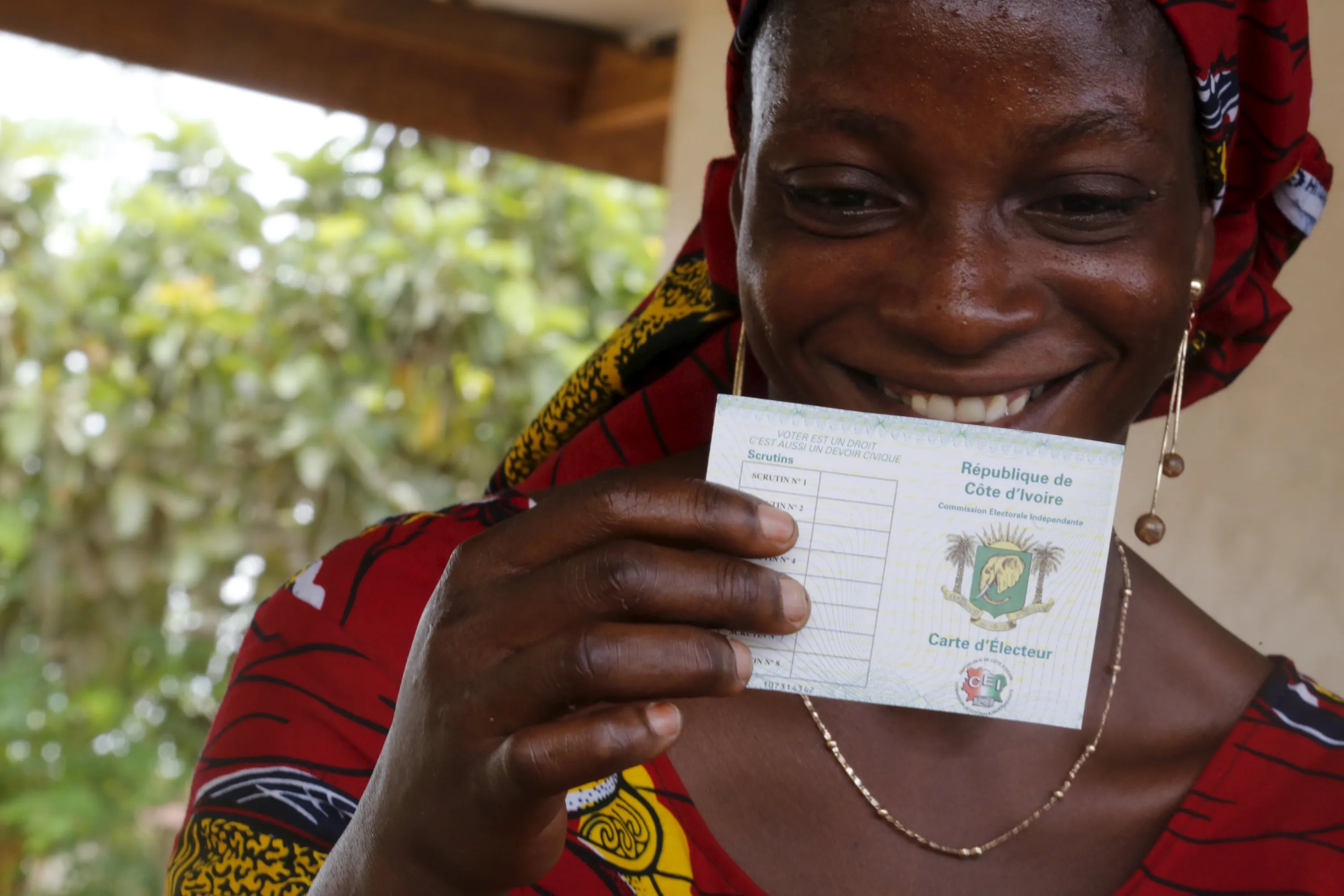 A woman smiles as she receeived her electoral card in GBAGBA, Bingerville district, Abidjan, Ivory Coast October 15, 2015. (Photo by Thierry Gouegnon/Reuters)