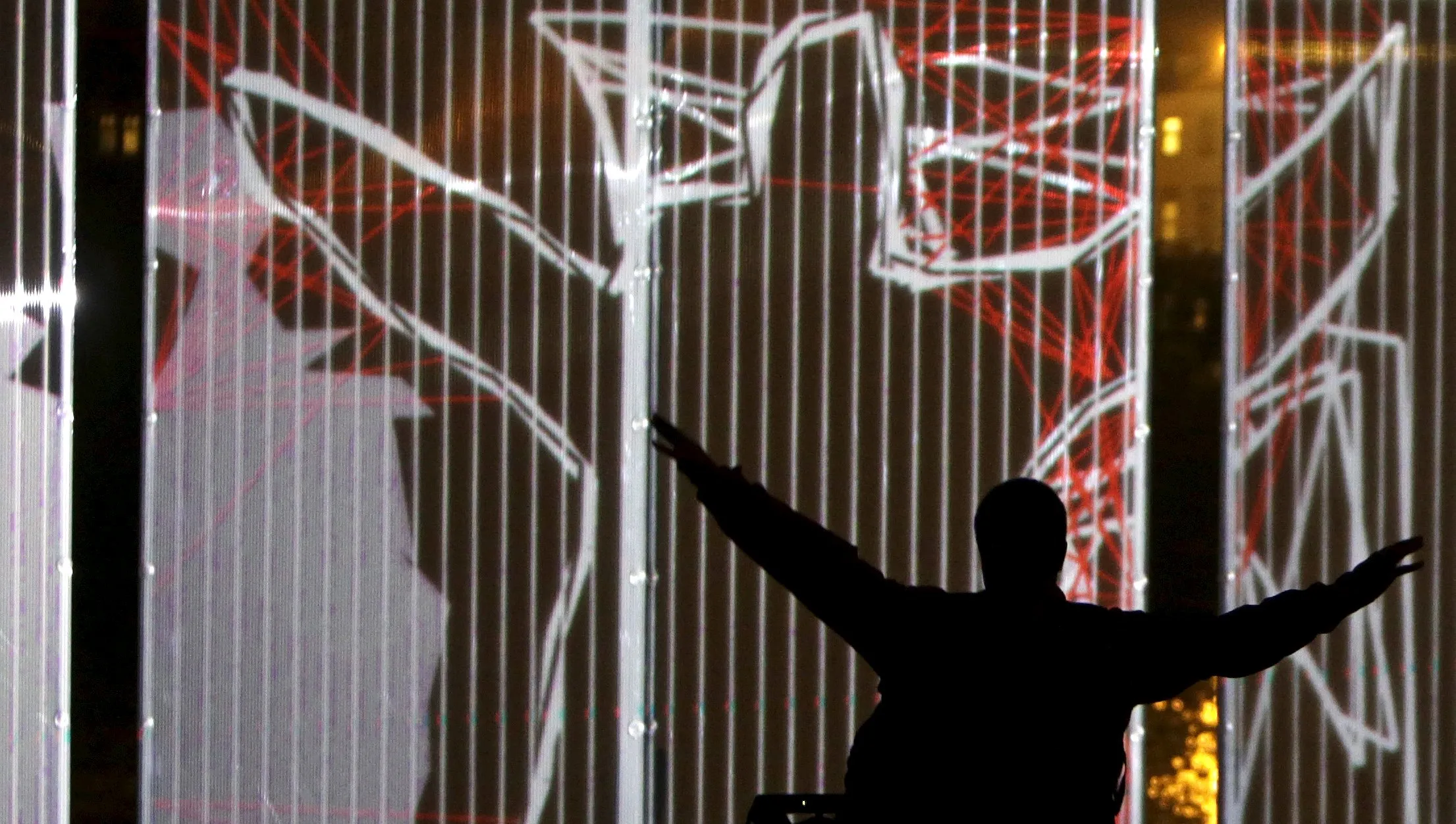 A man gestures in front of the installation "Wide/side" during the Signal light festival in Prague, Czech Republic, October 15, 2015. (Photo by David W. Cerny/Reuters)