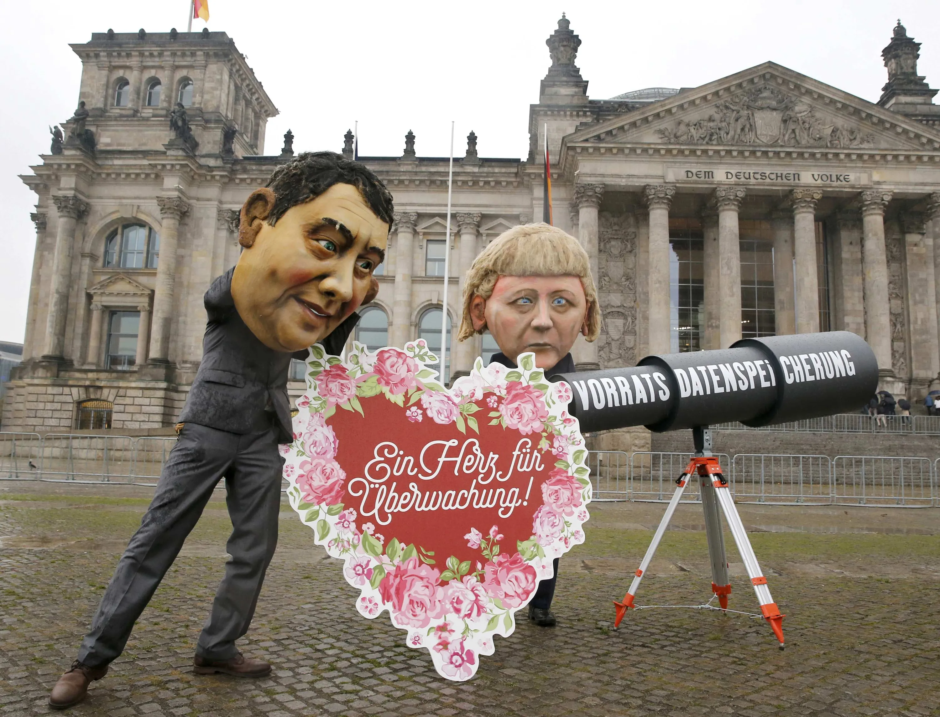 Activists wear masks depicting German Chancellor Angela Merkel (R) and German Economy Minister Sigmar Gabriel as they protest against a new data retention law in front of the Reichstag building, the seat of the lower house of parliament in Berlin, Germany, October 16, 2015. The German parliament gave the green light on Friday to a new data retention law that obliges telephone and Internet data to be stored for up to 10 weeks to help fight crime. Words read : 'A heart for surveillance' (L) and 'data retention'. (Photo by Fabrizio Bensch/Reuters)