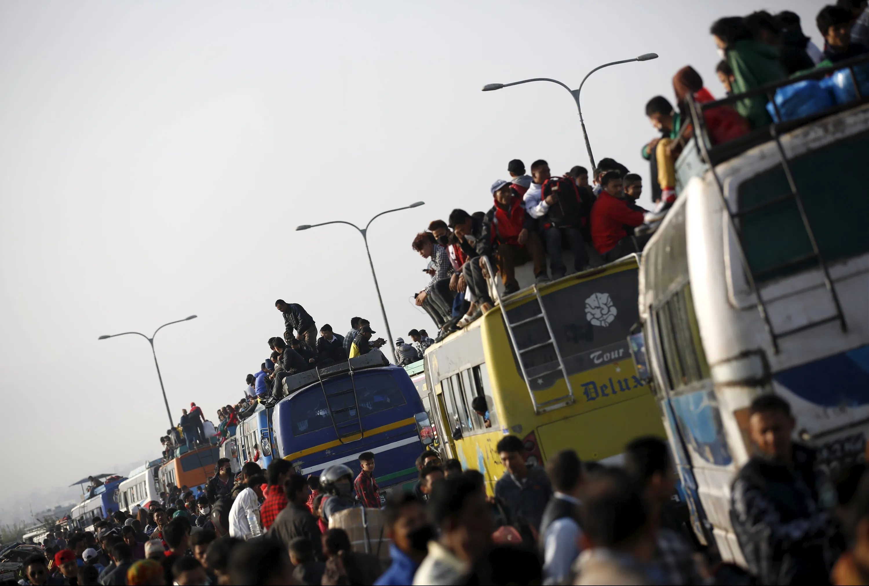 Passengers ride an overcrowded buses as they head towards their village to celebrate "Dashain", the biggest religious festival for Hindus in Nepal, as fuel crisis continues in Kathmandu, October 20, 2015. Many people who live in Nepal's capital hail from districts outside the Kathmandu Valley and return home for the festival. (Photo by Navesh Chitrakar/Reuters)