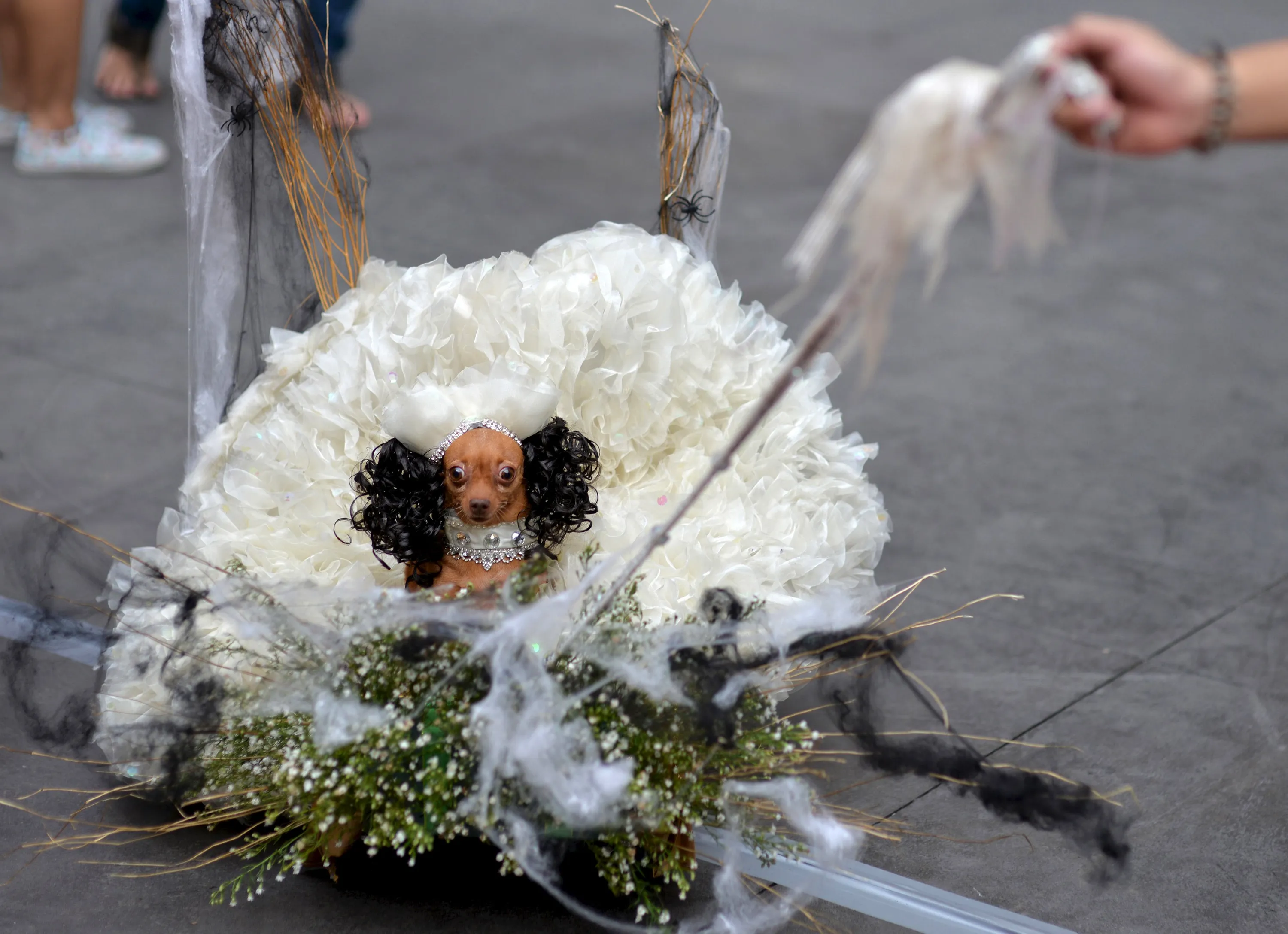 A dog wearing a princess costume is pulled in a carriage during a Halloween party for pets and kids at the Eastwood Mall in Quezon city, metro Manila, October 24, 2015. (Photo by Ezra Acayan/Reuters)
