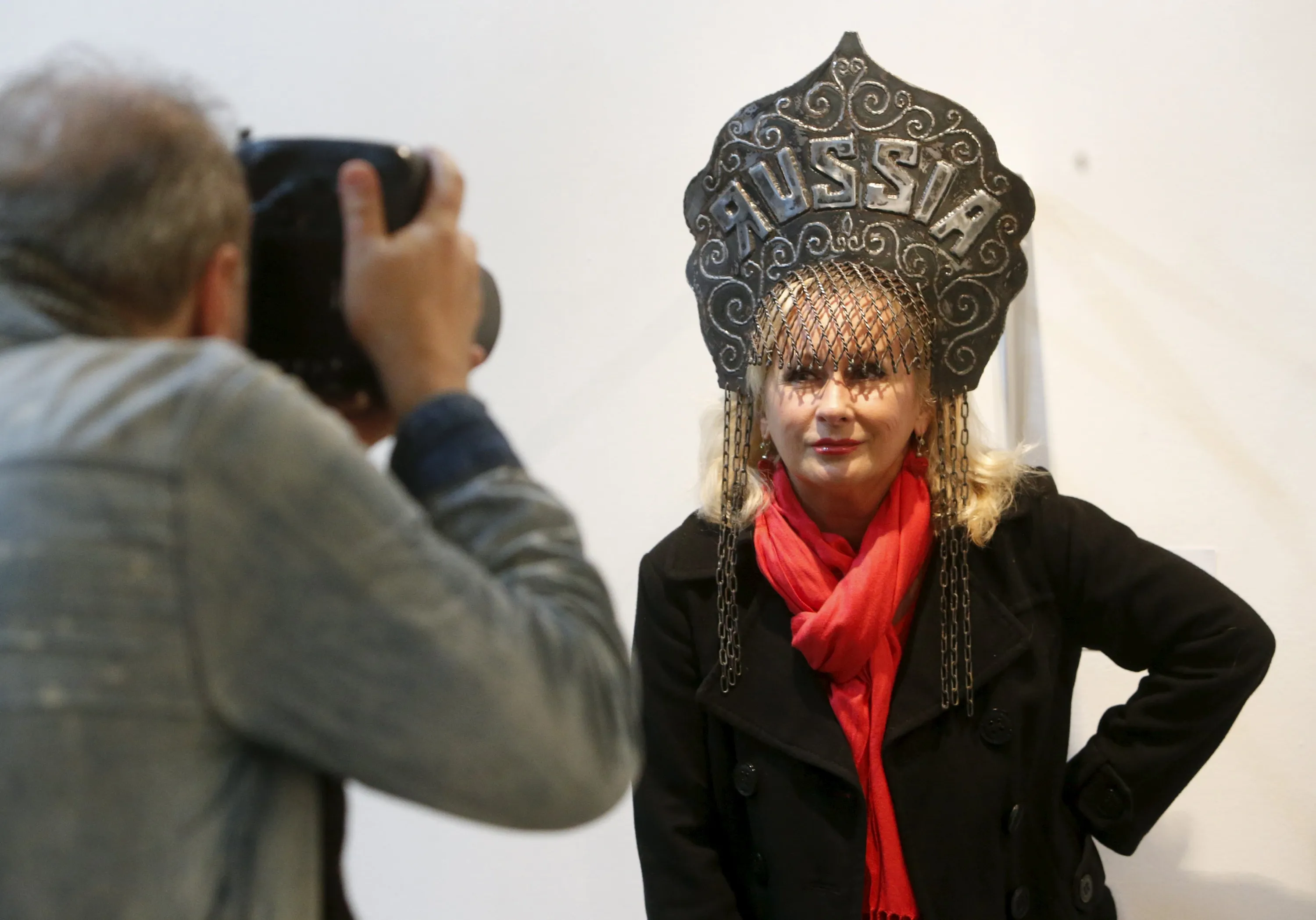 A woman wearing an art object from the project "Imperial Kokoshniks" by Russian artist Vasily Slonov, poses for a photograph during the exhibition "Quilted cavaliers of the apocalypse" at the Winzavod center of contemporary art in Moscow, Russia October 24, 2015. (Photo by Sergei Karpukhin/Reuters)