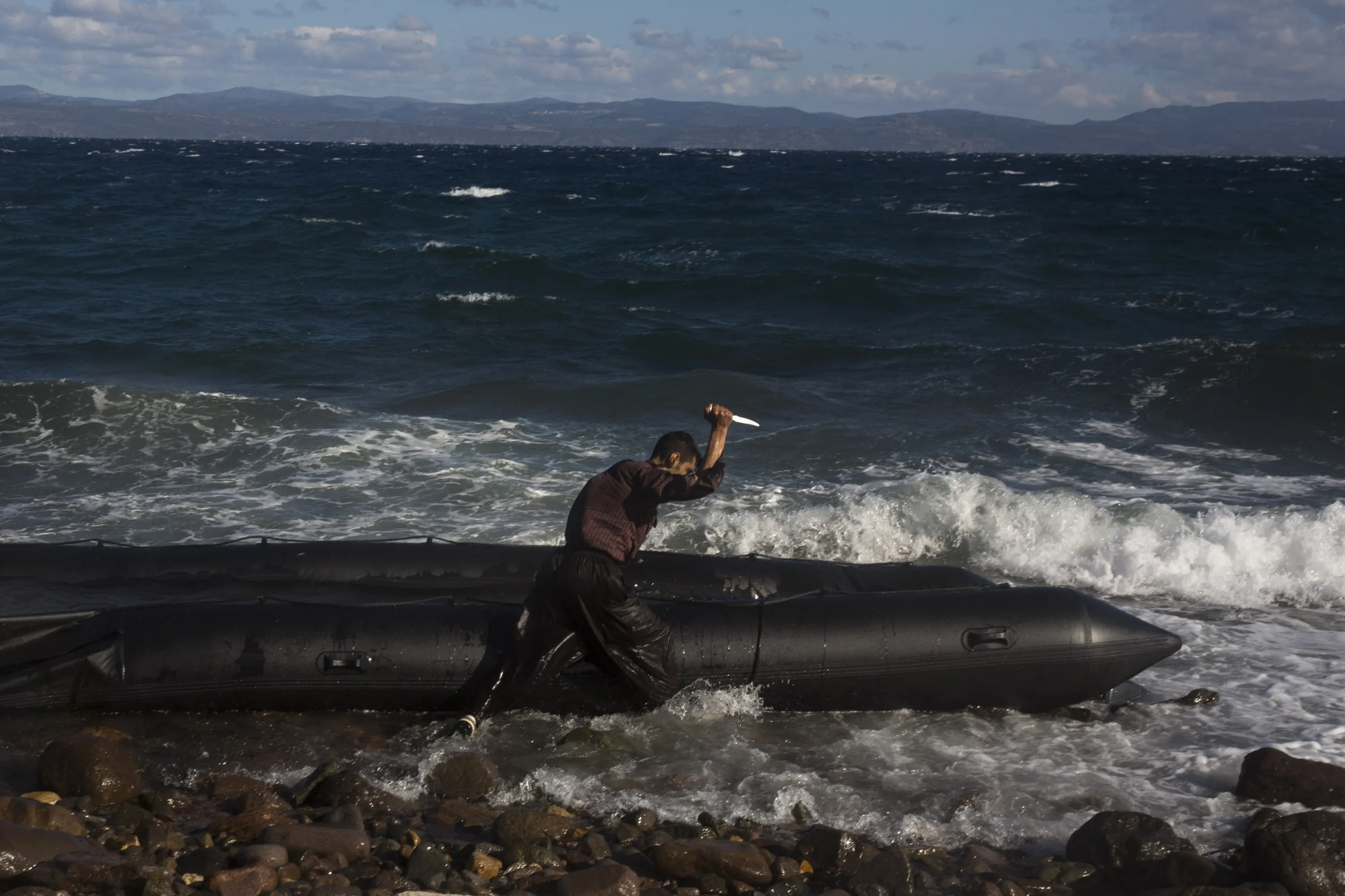 Afghan migrant uses a knife to puncture the dinghy in which he crossed with others from Turkey to the Greek island of Lesbos, Wednesday, October 28, 2015. Greece’s government says it is preparing a rent-assistance program to cope with a growing number of refugees, who face the oncoming winter and mounting resistance in Europe. (Photo by Santi Palacios/AP Photo)